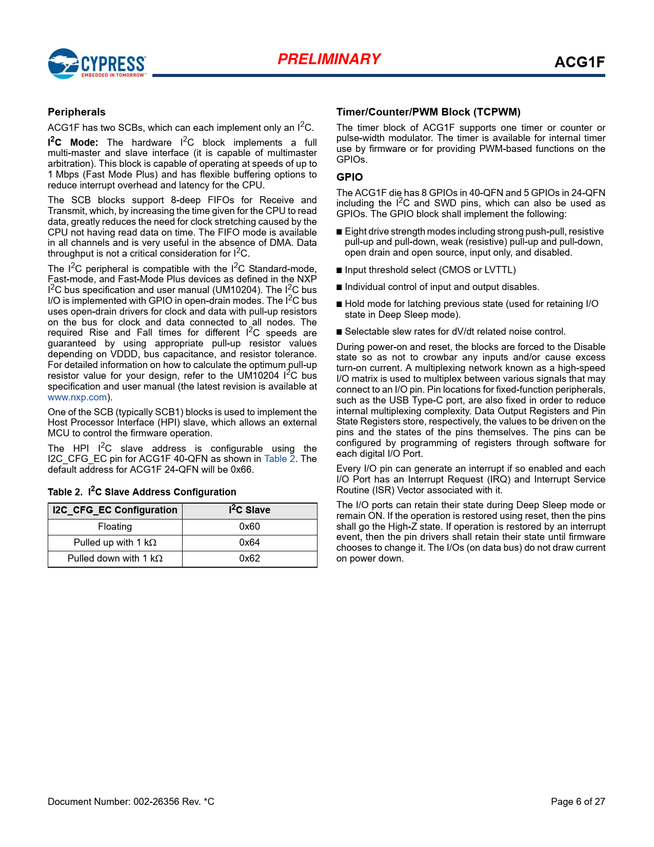 PRELIMINARY. ACG1F. Peripherals. Timer/Counter/PWM Block (TCPWM). I2C Mode:. GPIO. Table 2. I2C Slave Address Configuration