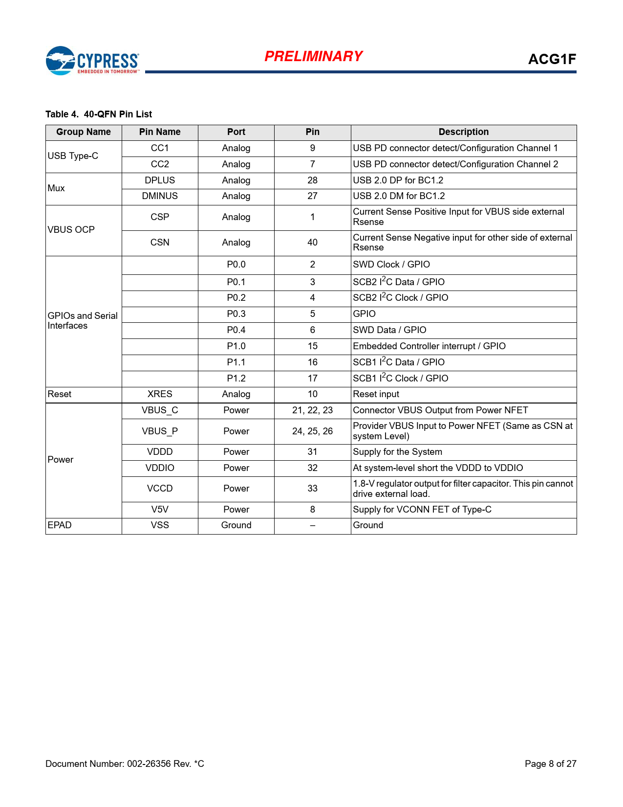 PRELIMINARY ACG1F Table 4 40-QFN Pin List Group Name Pin Name Port Pin Description