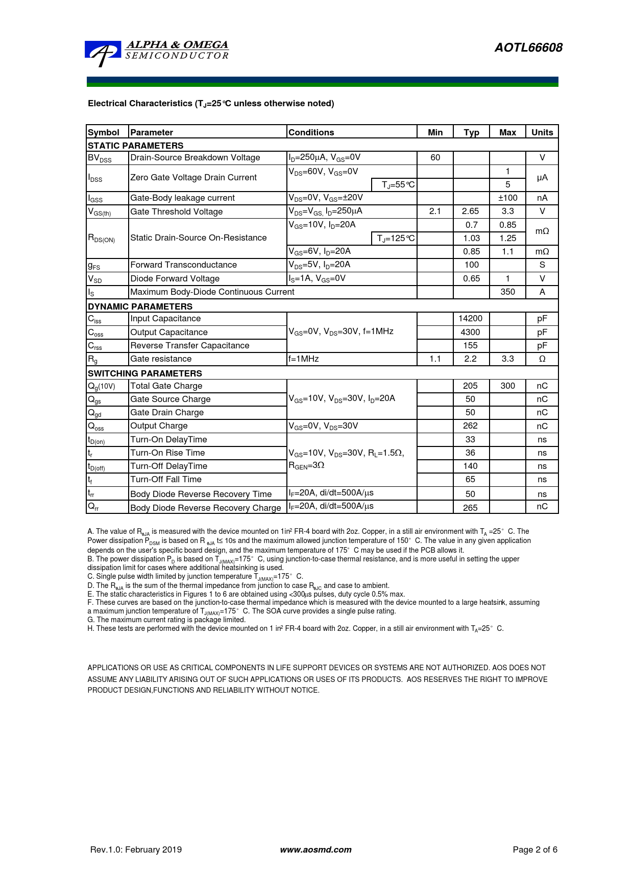 AOTL66608. Electrical Characteristics (TJ=25°C unless otherwise noted). Symbol. Parameter. Conditions. Min. Typ. Max. Units