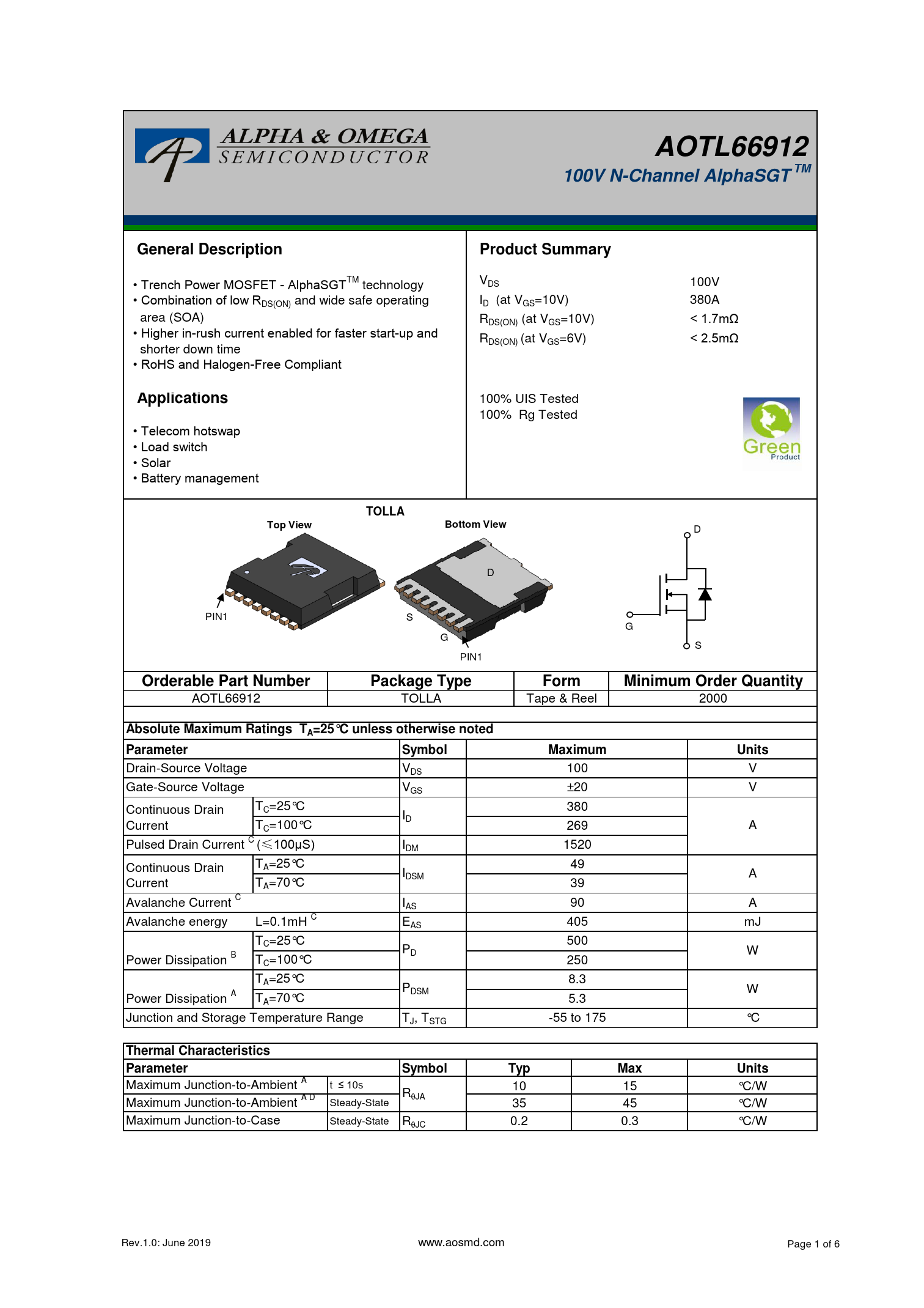AOTL66912100V N-Channel AlphaSGT TMGeneral DescriptionProduct Summary VDS • Trench Power MOSFET - AlphaSGTTM 100V technology • Combination of low R I DS(ON) and wide safe operating D (at VGS=10V) 380A area (SOA) RDS(ON) (at VGS=10V) < 1.7mΩ • Higher in-rush current enabled for faster start-up and RDS(ON) (at VGS=6V) < 2.5mΩ shorter down time • RoHS and Halogen-Free Compliant Applications 100% UIS Tested 100% Rg Tested • Telecom hotswap • Load switch • Solar • Battery management TOLLATop ViewBottom View D D PIN1 S G G S PIN1 Orderable Part NumberPackage TypeFormMinimum Order Quantity AOTL66912 TOLLA Tape & Reel 2000 Absolute Maximum Ratings TA=25°C unless otherwise notedParameterSymbolMaximumUnits Drain-Source Voltage VDS 100 V Gate-Source Voltage VGS ±20 V TC=25°C 380 Continuous Drain ID Current TC=100°C 269 A Pulsed Drain Current C (≤100μS) IDM 1520 TA=25°C Continuous Drain 49 IDSM A Current TA=70°C 39 Avalanche Current C IAS 90 A Avalanche energy L=0.1mH C EAS 405 mJ TC=25°C 500 PD W Power Dissipation B TC=100°C 250 TA=25°C 8.3 PDSM W Power Dissipation A TA=70°C 5.3 Junction and Storage Temperature Range TJ, TSTG -55 to 175 °C Thermal Characteristics ParameterSymbolTypMaxUnits Maximum Junction-to-Ambient A t ≤ 10s 10 15 °C/W RqJA Maximum Junction-to-Ambient A D Steady-State 35 45 °C/W Maximum Junction-to-Case Steady-State RqJC 0.2 0.3 °C/W Rev.1.0: June 2019 www.aosmd.com Page 1 of 6