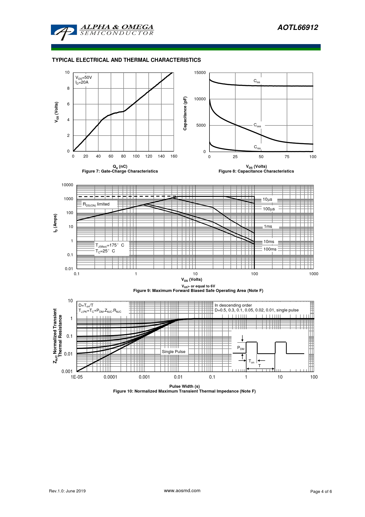 AOTL66912TYPICAL ELECTRICAL AND THERMAL CHARACTERISTICS 10 15000 V =50V DS Ciss I =20A D 8 ) F 10000 )p 6 ( e c(Voltsna itGS 4 cVa 5000 Coss Cap 2 Crss 0 0 0 20 40 60 80 100 120 140 160 0 25 50 75 100 Q (nC)V (Volts)gDSFigure 7: Gate-Charge CharacteristicsFigure 8: Capacitance Characteristics 10000 1000 10ms 10ms R limited DS(ON) 100ms 100 ) ps m (A 10 1ms I D 1 10ms T =175°C J(Max) 100ms T =25°C C 0.1 0.01 0.1 1 10 100 1000 V (Volts)DSV> or equal to 6VGSFigure 9: Maximum Forward Biased Safe Operating Area (Note F) 10 D=T /T In descending order t on n T =T +P .Z .R D=0.5, 0.3, 0.1, 0.05, 0.02, 0.01, single pulse J,PK C DM qJC qJC siece 1 anr antT sised 0.1 alizal Remr m P er DM No h Single Pulse 0.01 TJC q Z Ton T 0.001 1E-05 0.0001 0.001 0.01 0.1 1 10 100 Pulse Width (s)Figure 10: Normalized Maximum Transient Thermal Impedance (Note F) Rev.1.0: June 2019 www.aosmd.com Page 4 of 6
