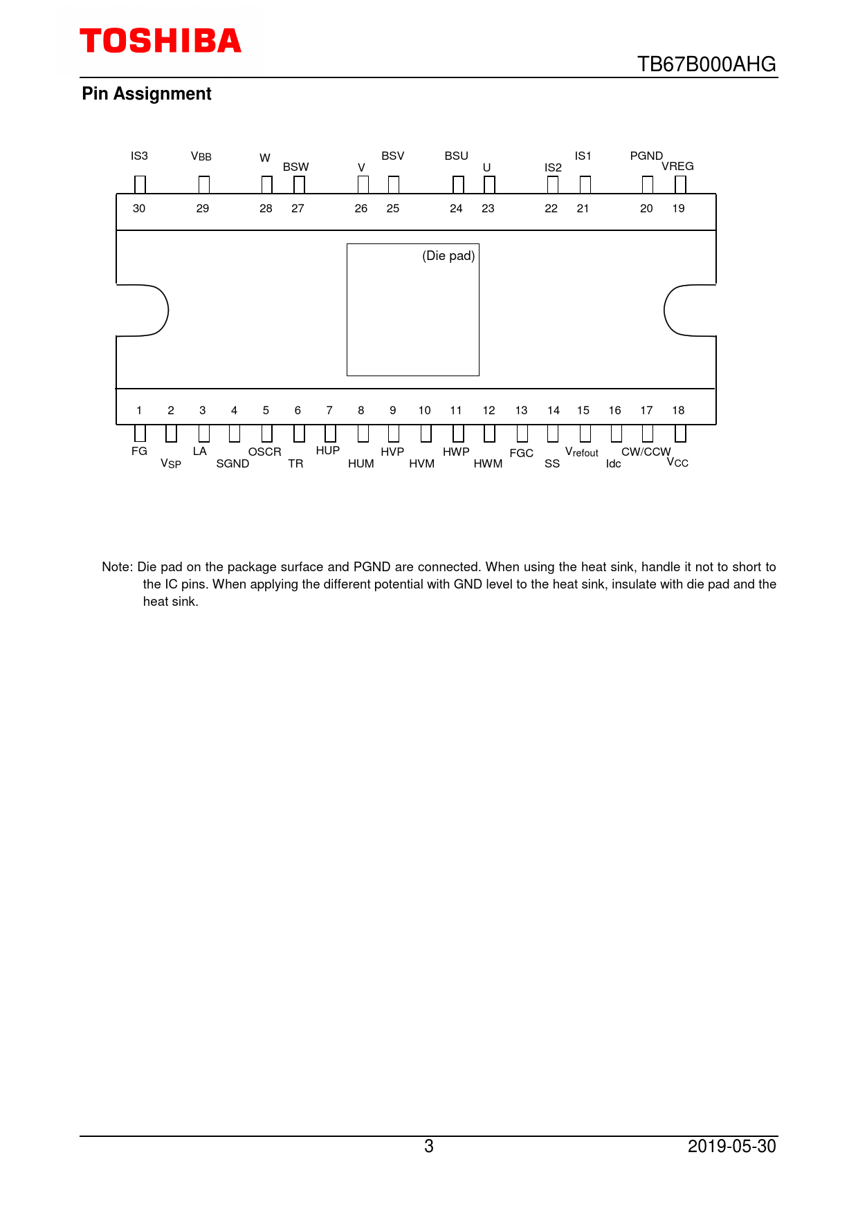 IS3 VBB W BSV BSU IS1 PGND BSW V U IS2 VREG 30 29 28 27 26 25 24 23 22 21 20 19 (Die pad) 1 2 3 4 5 6 7 8 9 10 11 12 13 14 15 16 17 18 FG LA OSCR HUP HVP HWP V FGC refout CW/CCW VSP SGND TR HUM HVM HWM SS Idc VCC Note: Die pad on the package surface and PGND are connected. When using the heat sink, handle it not to short to the IC pins. When applying the different potential with GND level to the heat sink, insulate with die pad and the heat sink. 3 2019-05-30 Document Outline TOSHIBA Bi-CMOS Power Integrated Circuit Multi-Chip Package (MCP) High voltage 3-Phase Full-Wave PWM Brushless Motor Driver Features Block Diagram Pin Assignment Pin Description Input/Output Equivalent Circuits Absolute Maximum Ratings (Ta = 25 C) Operating conditions (Ta = 25 C) Power Dissipation Electrical Characteristics (Ta = 25 C) Functional Description 1. Basic Operation 2. Voltage Command (VSP) Signal and Bootstrap Voltage Regulation 3. Dead Time Insertion (cross conduction protection) 4. Lead Angle Control 5. PWM Carrier Frequency 6. Position Detecting Pin <Hall device input> <Hall IC input> 7. Rotating Pulse Output Timing Chart of FG Signal 8. Protection-related Functions 9. Motor-lock detection Timing Chart Timing Chart 1: Output waveform of sine-wave PWM drive Timing Chart 2: Output waveform of sine-wave PWM drive Timing Chart 3: Output waveform of wide-angle commutation Timing Chart 4: Output waveform of wide-angle commutation Timing Chart 5: Output waveform of square-wave drive Timing Chart 6: Output waveform of square-wave drive Timing Chart 7: Output waveform of square-wave drive Timing Chart 8: Output waveform of square-wave drive Application Circuit Example External Parts Package Dimensions Notes on Contents IC Usage Considerations Notes on handling of ICs PD MAX – Ta 40 Power dissipation PD MAX (W) 30 20 10 0 0 25 50 75 100 125 150 Ambient temperature Ta ( C) ① INFINITE HEAT SINK : R(j-c = 1 C/W ② When mounted on the board (74.2 × 114.3 × 1.6 mm, Cu20%), HEAT SINK (10 × 10 × 1 mm, Cu) : R(j-a = 17 C/W ③ When mounted on the board (74.2 × 114.3 × 1.6 mm, Cu20%) : R(j-a = 35 C/W ④ IC only : R(j-a = 53 C/W PWM Duty (1) (2) (3) 92% 2.1 V 1.0 V 5.4 V VSP (4) 7.3 V 8.2 V 10 V (1) (2) (3) 2.1 V 1.0 V 5.4 V VSP (4) 7.3 V 8.2 V 10 V PWM Duty (Upper phase) *95% (typ.) *2.4% (typ.) RESTRICTIONS ON PRODUCT USE