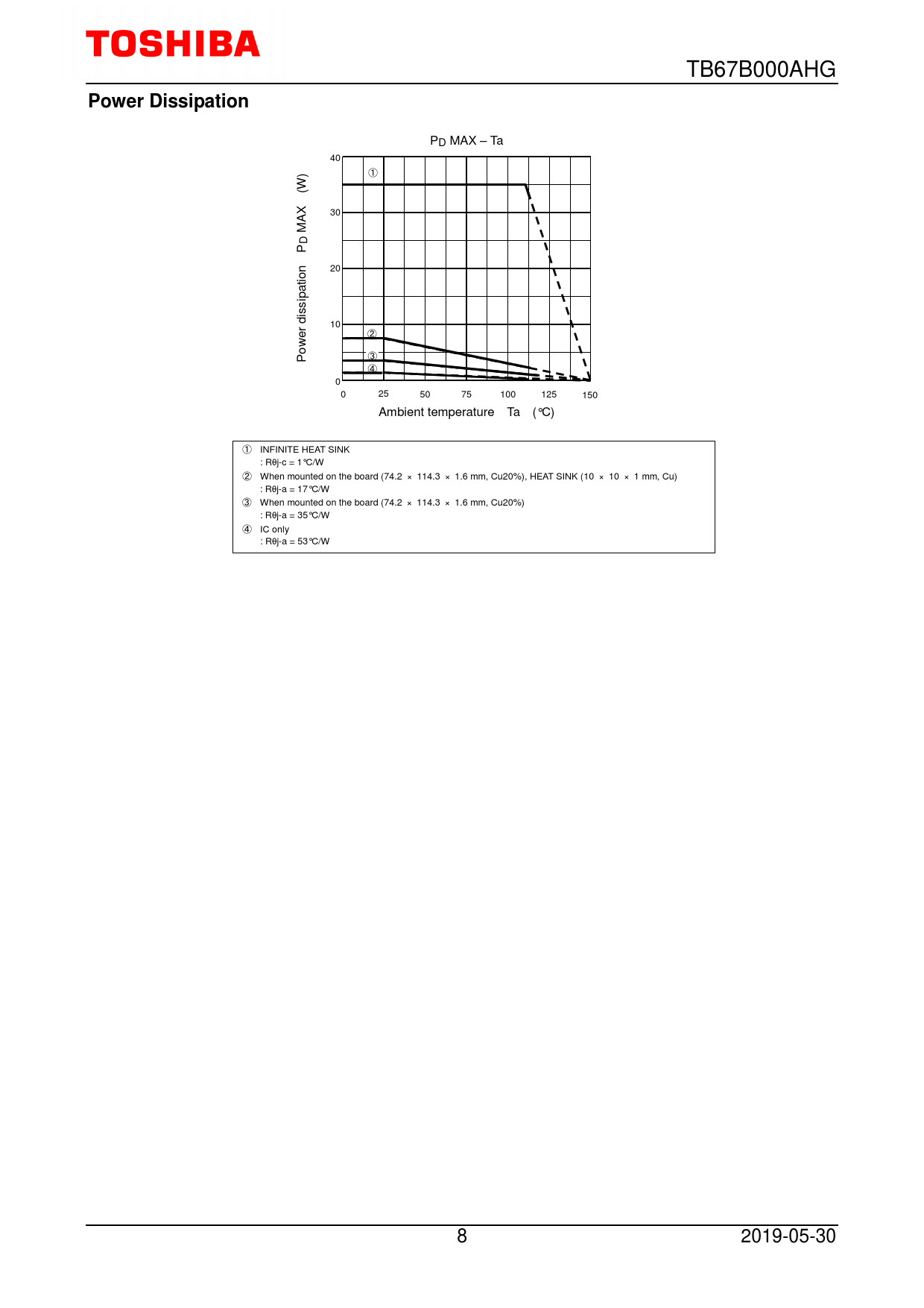 PD MAX – Ta 40 ) ① (W X 30 MA D P 20 ion at ip s s di 10 er ② ow ③ P ④ 0 0 25 50 75 100 125 150 Ambient temper ature Ta (°C) ① INFINITE HEAT SINK : Rθj-c = 1°C/W ② When mounted on the board (74.2 × 114.3 × 1.6 mm, Cu20%), HEAT SINK (10 × 10 × 1 mm, Cu) : Rθj-a = 17°C/W ③ When mounted on the board (74.2 × 114.3 × 1.6 mm, Cu20%) : Rθj-a = 35°C/W ④ IC only : Rθj-a = 53°C/W 8 2019-05-30 Document Outline TOSHIBA Bi-CMOS Power Integrated Circuit Multi-Chip Package (MCP) High voltage 3-Phase Full-Wave PWM Brushless Motor Driver Features Block Diagram Pin Assignment Pin Description Input/Output Equivalent Circuits Absolute Maximum Ratings (Ta = 25 C) Operating conditions (Ta = 25 C) Power Dissipation Electrical Characteristics (Ta = 25 C) Functional Description 1. Basic Operation 2. Voltage Command (VSP) Signal and Bootstrap Voltage Regulation 3. Dead Time Insertion (cross conduction protection) 4. Lead Angle Control 5. PWM Carrier Frequency 6. Position Detecting Pin <Hall device input> <Hall IC input> 7. Rotating Pulse Output Timing Chart of FG Signal 8. Protection-related Functions 9. Motor-lock detection Timing Chart Timing Chart 1: Output waveform of sine-wave PWM drive Timing Chart 2: Output waveform of sine-wave PWM drive Timing Chart 3: Output waveform of wide-angle commutation Timing Chart 4: Output waveform of wide-angle commutation Timing Chart 5: Output waveform of square-wave drive Timing Chart 6: Output waveform of square-wave drive Timing Chart 7: Output waveform of square-wave drive Timing Chart 8: Output waveform of square-wave drive Application Circuit Example External Parts Package Dimensions Notes on Contents IC Usage Considerations Notes on handling of ICs PD MAX – Ta 40 Power dissipation PD MAX (W) 30 20 10 0 0 25 50 75 100 125 150 Ambient temperature Ta ( C) ① INFINITE HEAT SINK : R(j-c = 1 C/W ② When mounted on the board (74.2 × 114.3 × 1.6 mm, Cu20%), HEAT SINK (10 × 10 × 1 mm, Cu) : R(j-a = 17 C/W ③ When mounted on the board (74.2 × 114.3 × 1.6 mm, Cu20%) : R(j-a = 35 C/W ④ IC only : R(j-a = 53 C/W PWM Duty (1) (2) (3) 92% 2.1 V 1.0 V 5.4 V VSP (4) 7.3 V 8.2 V 10 V (1) (2) (3) 2.1 V 1.0 V 5.4 V VSP (4) 7.3 V 8.2 V 10 V PWM Duty (Upper phase) *95% (typ.) *2.4% (typ.) RESTRICTIONS ON PRODUCT USE