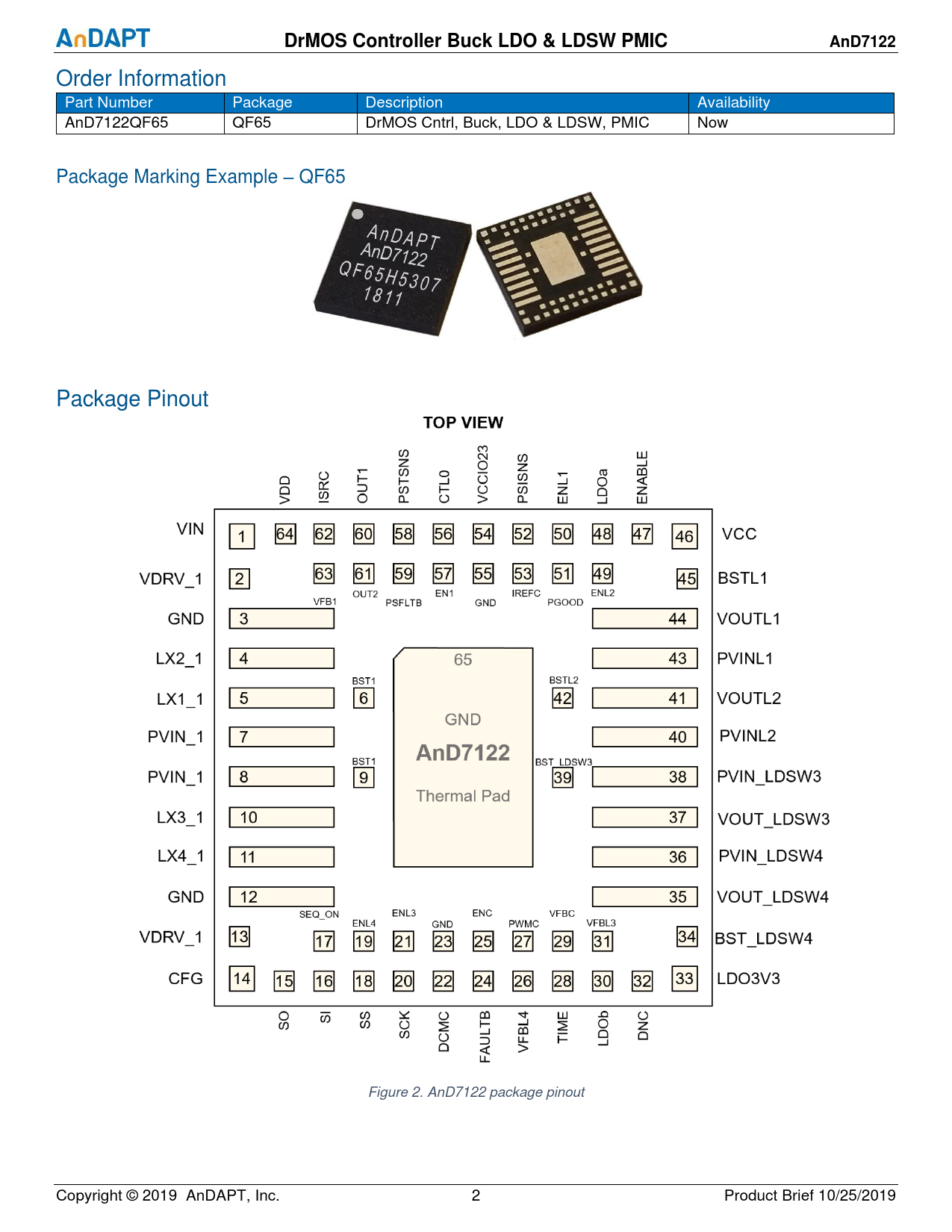 Order Information Part Number Package Description Availability AnD7122QF65 QF65 DrMOS Cntrl, Buck, LDO & LDSW, PMIC Now Package Marking Example – QF65 Package Pinout Figure 2. AnD7122 package pinout Copyright © 2019 AnDAPT, Inc. 2 Product Brief 10/25/2019