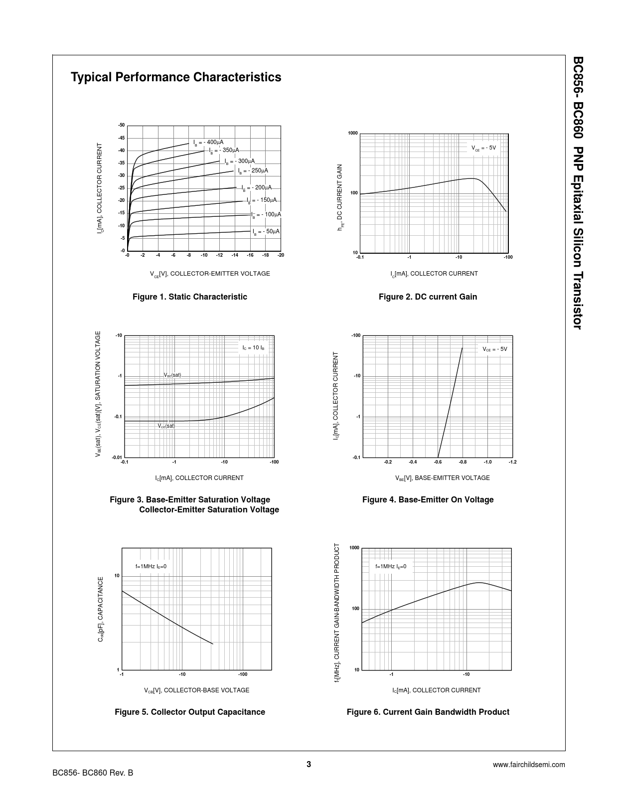 Collector-Emitter Saturation Voltage Cob[pF], CAPACITANCE -10 IC[mA], COLLECTOR CURRENT Figure 1. Static Characteristic VBE(sat), VCE(sat)[V], SATURATION VOLTAGE -1 www.fairchildsemi.com BC856-BC860 PNP Epitaxial Silicon Transistor Typical Performance Characteristics