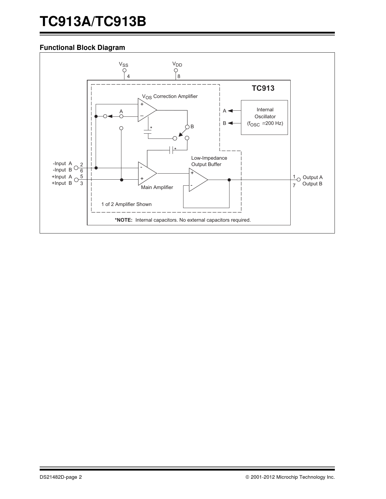 TC913A/TC913BFunctional Block Diagram V V SS DD 4 8 TC913 VOS Correction Amplifier + A A Internal – Oscillator B (f B OSC 200 Hz) * * Low-Impedance -Input A 2 - Output Buffer -Input B 6 + +Input A 5 + 1 Output A +Input B 3 - Output B Main Amplifier 7 1 of 2 Amplifier Shown *NOTE: Internal capacitors. No external capacitors required. DS21482D-page 2 2001-2012 Microchip Technology Inc. Document Outline TC913A/TC913B Features: Applications: Device Selection Table Package Type General Description: Functional Block Diagram 1.0 Electrical characteristics Absolute Maximum Ratings* tc913a and tc913b electrical specifications Note 1: Characterized; not 100% tested. 2.0 Pin Descriptions TABLE 2-1: Pin Function Table 3.0 Detailed Description 3.1 Theory of Operation 3.2 Pin Compatibility 3.3 Overload Recovery 3.4 Avoiding Latch-up 4.0 Typical Characteristics 5.0 packaging information 5.1 Package Marking Information 5.2 Taping Form 5.3 Package Dimensions 6.0 Revision History Notes: Dual Auto-Zeroed Operational Amplifiers The Microchip Web Site Customer Change Notification Service Customer Support Reader Response Corporate Office Atlanta Boston Chicago Cleveland Fax: 216-447-0643 Dallas Detroit Indianapolis Toronto Fax: 852-2401-3431 Australia - Sydney China - Beijing China - Shanghai India - Bangalore Korea - Daegu Korea - Seoul Singapore Taiwan - Taipei Fax: 43-7242-2244-393 Denmark - Copenhagen France - Paris Germany - Munich Italy - Milan Spain - Madrid UK - Wokingham Worldwide Sales and Service