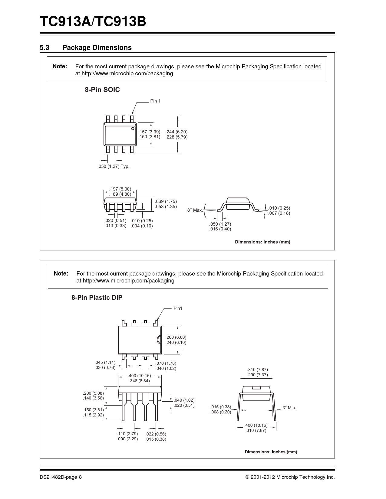 TC913A/TC913B. 5.3. Package Dimensions. Note:. 8-Pin SOIC. Dimensions: inches (mm). 8-Pin Plastic DIP