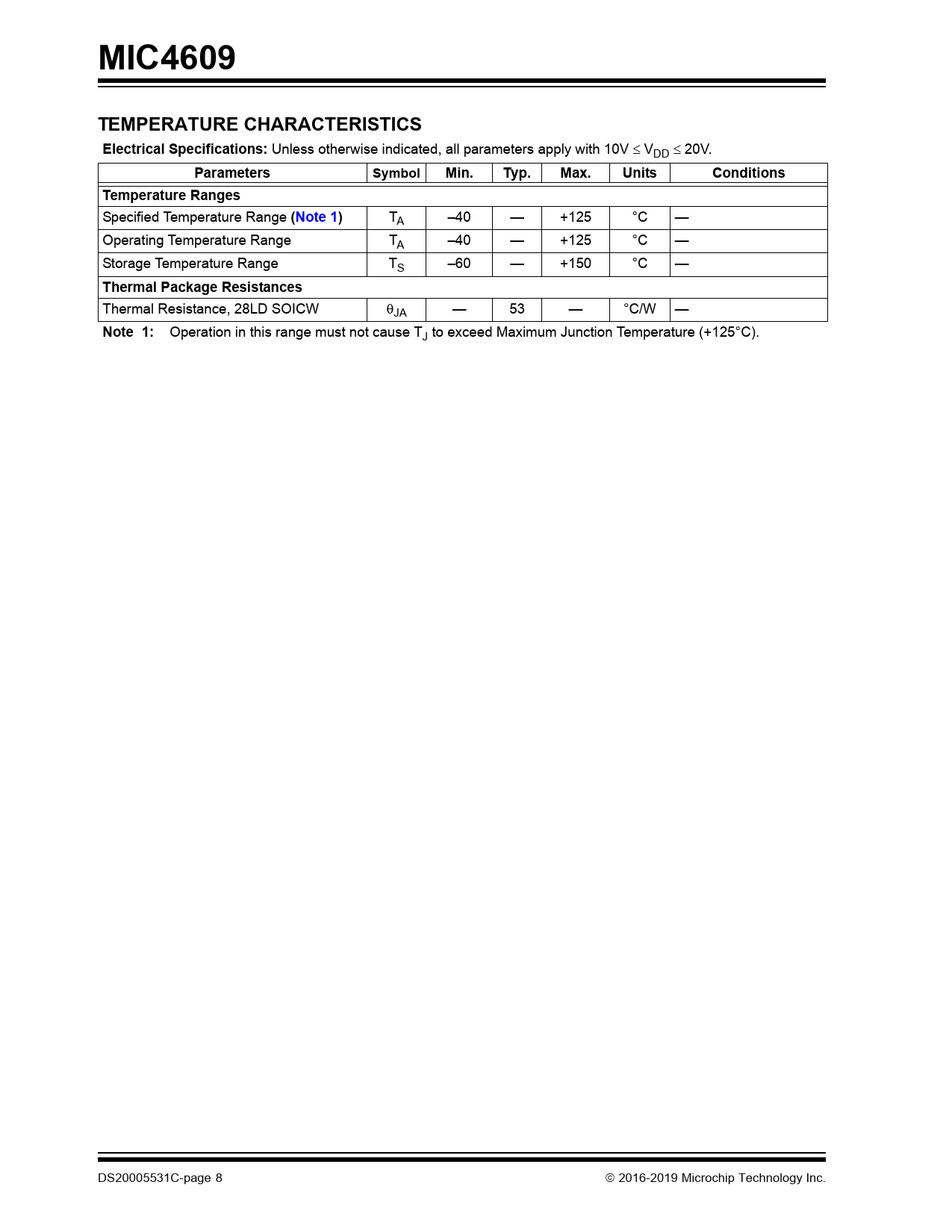 MIC4609. TEMPERATURE CHARACTERISTICS. Electrical Specifications:. Parameters. Symbol. Min. Typ. Max. Units. Conditions. Temperature Ranges