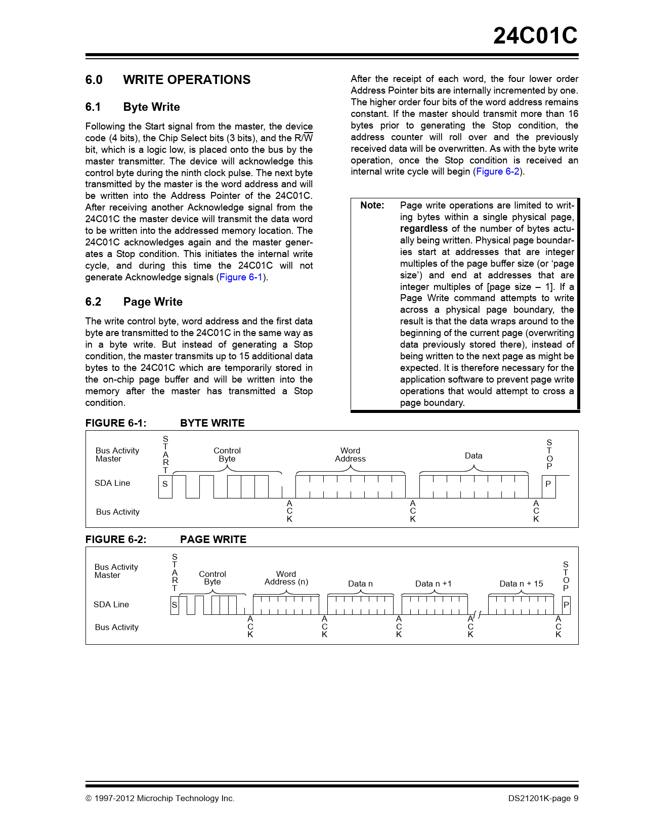 link to page 9 link to page 9 24C01C6.0WRITE OPERATIONS After the receipt of each word, the four lower order Address Pointer bits are internally incremented by one. 6.1Byte Write The higher order four bits of the word address remains constant. If the master should transmit more than 16 Following the Start signal from the master, the device bytes prior to generating the Stop condition, the code (4 bits), the Chip Select bits (3 bits), and the R/W address counter will roll over and the previously bit, which is a logic low, is placed onto the bus by the received data will be overwritten. As with the byte write master transmitter. The device will acknowledge this operation, once the Stop condition is received an control byte during the ninth clock pulse. The next byte internal write cycle will begin (Figure 6-2). transmitted by the master is the word address and will be written into the Address Pointer of the 24C01C. After receiving another Acknowledge signal from the Note: Page write operations are limited to writ- 24C01C the master device will transmit the data word ing bytes within a single physical page, to be written into the addressed memory location. The regardless of the number of bytes actu- 24C01C acknowledges again and the master gener- ally being written. Physical page boundar- ates a Stop condition. This initiates the internal write ies start at addresses that are integer cycle, and during this time the 24C01C wil not multiples of the page buffer size (or ‘page generate Acknowledge signals (Figure 6-1). size’) and end at addresses that are integer multiples of [page size – 1]. If a 6.2Page Write Page Write command attempts to write across a physical page boundary, the The write control byte, word address and the first data result is that the data wraps around to the byte are transmitted to the 24C01C in the same way as beginning of the current page (overwriting in a byte write. But instead of generating a Stop data previously stored there), instead of condition, the master transmits up to 15 additional data being written to the next page as might be bytes to the 24C01C which are temporarily stored in expected. It is therefore necessary for the the on-chip page buffer and will be written into the application software to prevent page write memory after the master has transmitted a Stop operations that would attempt to cross a condition. page boundary. FIGURE 6-1:BYTE WRITE S S Bus Activity T Control Word T Master A R Byte Address Data O T P SDA Line S P A A A Bus Activity C C C K K K FIGURE 6-2:PAGE WRITE S Bus Activity T S Master A Control Word T R Byte Address (n) Data n Data n +1 Data n + 15 O T P SDA Line S P A A A A A Bus Activity C C C C C K K K K K 1997-2012 Microchip Technology Inc. DS21201K-page 9 Document Outline 24C01C Features: Description: Block Diagram Package Types 1.0 Electrical Characteristics Absolute Maximum Ratings(†) TABLE 1-1: DC Characteristics TABLE 1-2: AC Characteristics FIGURE 1-1: Bus Timing Data 2.0 Pin Descriptions TABLE 2-1: Pin Function Table 2.1 SDA Serial Data 2.2 SCL Serial Clock 2.3 A0, A1, A2 2.4 Test 2.5 Noise Protection 3.0 Functional Description 4.0 Bus Characteristics 4.1 Bus Not Busy (A) 4.2 Start Data Transfer (B) 4.3 Stop Data Transfer (C) 4.4 Data Valid (D) 4.5 Acknowledge FIGURE 4-1: Data Transfer Sequence on the Serial Bus FIGURE 4-2: Acknowledge Timing 5.0 Device Addressing FIGURE 5-1: Control Byte Format 5.1 Contiguous Addressing Across Multiple Devices 6.0 Write Operations 6.1 Byte Write 6.2 Page Write FIGURE 6-1: Byte Write FIGURE 6-2: Page Write 7.0 Acknowledge Polling FIGURE 7-1: Acknowledge Polling Flow 8.0 Read Operation 8.1 Current Address Read FIGURE 8-1: Current Address Read 8.2 Random Read 8.3 Sequential Read FIGURE 8-2: Random Read FIGURE 8-3: Sequential Read 9.0 Packaging Information 9.1 Package Marking Information Appendix A: Revision History The Microchip Web Site Customer Change Notification Service Customer Support Reader Response Product Identification System Trademarks Worldwide Sales
