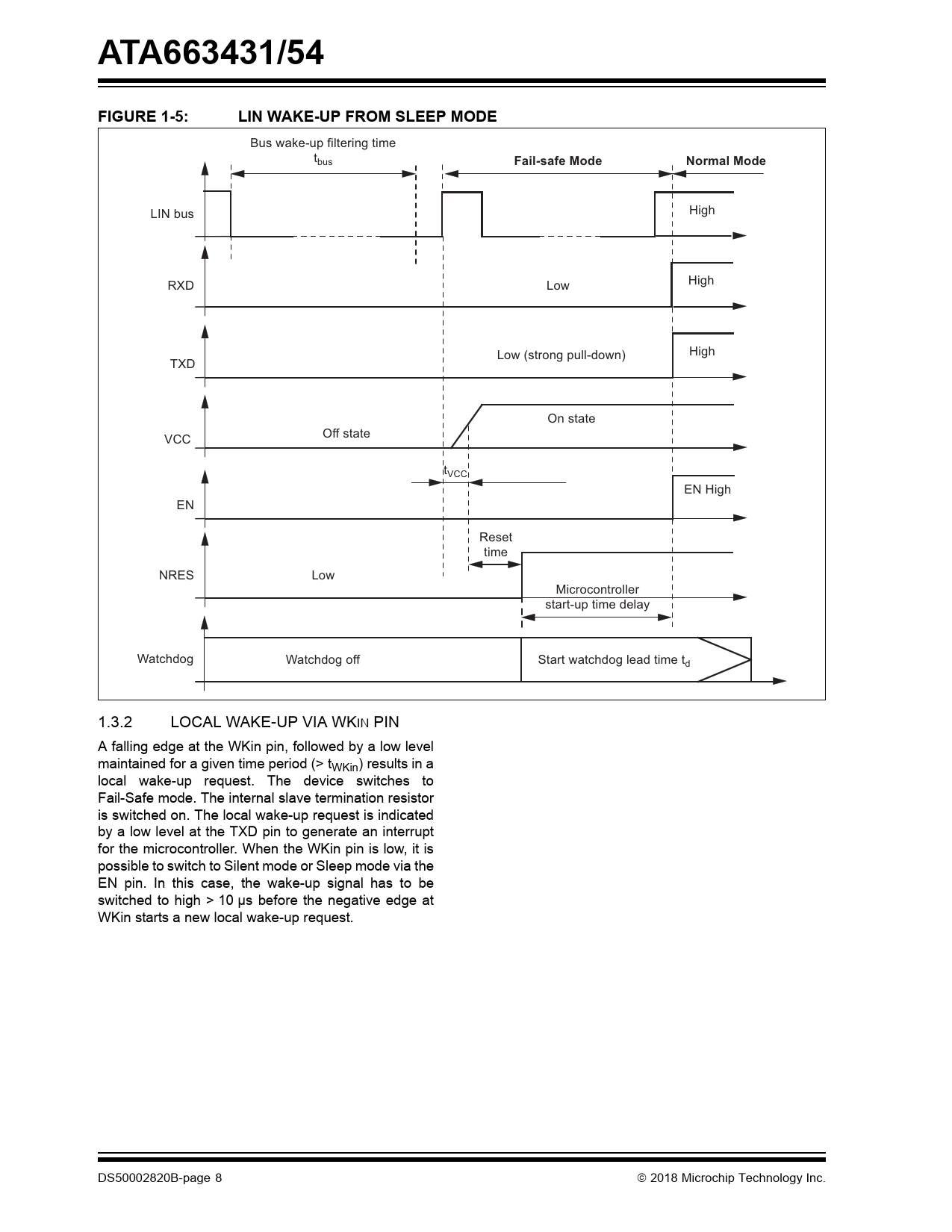 LIN bus High RXD Low High Low (strong pull-down) High TXD On state Off state VCC tVCC EN High EN Reset time NRES Low Microcontroller start-up time delay Watchdog Watchdog off Start watchdog lead time td 1.3.2 LOCAL WAKE-UP VIA WKIN PIN A falling edge at the WKin pin, followed by a low level maintained for a given time period (> tWKin) results in a local wake-up request. The device switches to Fail-Safe mode. The internal slave termination resistor is switched on. The local wake-up request is indicated by a low level at the TXD pin to generate an interrupt for the microcontroller. When the WKin pin is low, it is possible to switch to Silent mode or Sleep mode via the EN pin. In this case, the wake-up signal has to be switched to high > 10 μs before the negative edge at WKin starts a new local wake-up request. DS50002820B-page 8  2018 Microchip Technology Inc. Document Outline Features General Description Package Types Block Diagram 1.0 Functional Description 1.1 Physical Layer Compatibility 1.2 Operating Modes FIGURE 1-1: Operating Modes TABLE 1-1: Operating Modes (Mode Pin Is Always Low) 1.2.1 Normal Mode 1.2.2 Silent Mode FIGURE 1-2: Switching to Silent mode 1.2.3 Sleep Mode FIGURE 1-3: Switching to Sleep Mode 1.2.4 Fail-Safe mode TABLE 1-2: Signaling in Fail-safe Mode 1.3 Wake-up Scenarios from Silent Mode or Sleep Mode 1.3.1 Remote Wake-up via LIN Bus 1.3.1.1 Remote Wake-up from Silent Mode FIGURE 1-4: LIN Wake-up from Silent Mode 1.3.1.2 Remote Wake-up from Sleep Mode FIGURE 1-5: LIN Wake-up from Sleep Mode 1.3.2 Local Wake-up via WKin Pin FIGURE 1-6: Local Wake-up via WKin pin from Sleep Mode FIGURE 1-7: Local Wake-up via WKin pin from Silent Mode 1.3.3 Local Wake-up via CL15 1.3.4 Wake-up Source Recognition TABLE 1-3: Signaling in Fail-Safe Mode 1.4 Behavior under Low Supply Voltage Conditions FIGURE 1-8: VCC and NRES versus VS (Ramp-up) for ATA663431 FIGURE 1-9: VCC and NRES versus VS (Ramp-down) for ATA663431 FIGURE 1-10: VCC and NRES versus VS (Ramp-up) for ATA663454 FIGURE 1-11: VCC and NRES versus VS (Ramp-Down) for ATA663454 1.5 Voltage Regulator FIGURE 1-12: VCC Voltage Regulator: Supply Voltage Ramp-up and Ramp-down FIGURE 1-13: Power Dissipation: Safe Operating Area: Regulator’s Output Current IVCC versus Supply Voltage VVS at Different Ambient Temperatures (RthvJA = 45 K/W assumed) 1.6 Watchdog FIGURE 1-14: Limp Home (LH) State Diagram 1.6.1 Typical Timing Sequence with RWDOSC = 51 kΩ EQUATION 1-1: FIGURE 1-15: Timing Sequence with RWDOSC = 51 kΩ 1.6.2 Worst-Case Calculation with RWDOSC = 51 kΩ EQUATION 1-2: TABLE 1-4: Typical Watchdog Timings 1.7 Pin Descriptions TABLE 1-5: Pin Description 1.7.1 Bus Data Output Pin (RXD) 1.7.2 Enable Input Pin (EN) 1.7.3 Undervoltage Reset Output Pin (NRES) 1.7.4 Bus Data Input/Output (TXD) 1.7.5 NTRIG Input Pin 1.7.6 Mode Input Pin (MODE) 1.7.7 WDOSC Output Pin 1.7.8 High-side Switch Pins (HSout, HSin) 1.7.9 Limp Home Watchdog Failure Output (LH) 1.7.10 CL15 Pin 1.7.11 Wake Input Pin (WKin) 1.7.12 Ground Pin (GND) 1.7.13 Bus Pin (LIN) 1.7.14 Supply Pin (VS) 1.7.15 Voltage Regulator Output Pin (VCC) Typical Application Circuit 2.0 Electrical Characteristics 2.1 Absolute Maximum Ratings† Electrical Characteristics FIGURE 2-1: Definition of Bus timing Characteristics Temperature Specifications 3.0 Packaging Information 3.1 Package Marking Information LIN SBC including LIN Transceiver, Voltage Regulator, Window Watchdog and High-Side Switch Appendix A: Revision History Revision A (November 2018) Revision B (November 2018) Product Identification System AMERICAS Corporate Office Atlanta Austin, TX Boston Chicago Dallas Detroit Houston, TX Indianapolis Los Angeles Raleigh, NC New York, NY San Jose, CA Canada - Toronto ASIA/PACIFIC Australia - Sydney China - Beijing China - Chengdu China - Chongqing China - Dongguan China - Guangzhou China - Hangzhou China - Hong Kong SAR China - Nanjing China - Qingdao China - Shanghai China - Shenyang China - Shenzhen China - Suzhou China - Wuhan China - Xian China - Xiamen China - Zhuhai ASIA/PACIFIC India - Bangalore India - New Delhi India - Pune Japan - Osaka Japan - Tokyo Korea - Daegu Korea - Seoul Malaysia - Kuala Lumpur Malaysia - Penang Philippines - Manila Singapore Taiwan - Hsin Chu Taiwan - Kaohsiung Taiwan - Taipei Thailand - Bangkok Vietnam - Ho Chi Minh EUROPE Austria - Wels Denmark - Copenhagen Finland - Espoo France - Paris Germany - Garching Germany - Haan Germany - Heilbronn Germany - Karlsruhe Germany - Munich Germany - Rosenheim Israel - Ra’anana Italy - Milan Italy - Padova Netherlands - Drunen Norway - Trondheim Poland - Warsaw Romania - Bucharest Spain - Madrid Sweden - Gothenberg Sweden - Stockholm UK - Wokingham Worldwide Sales and Service
