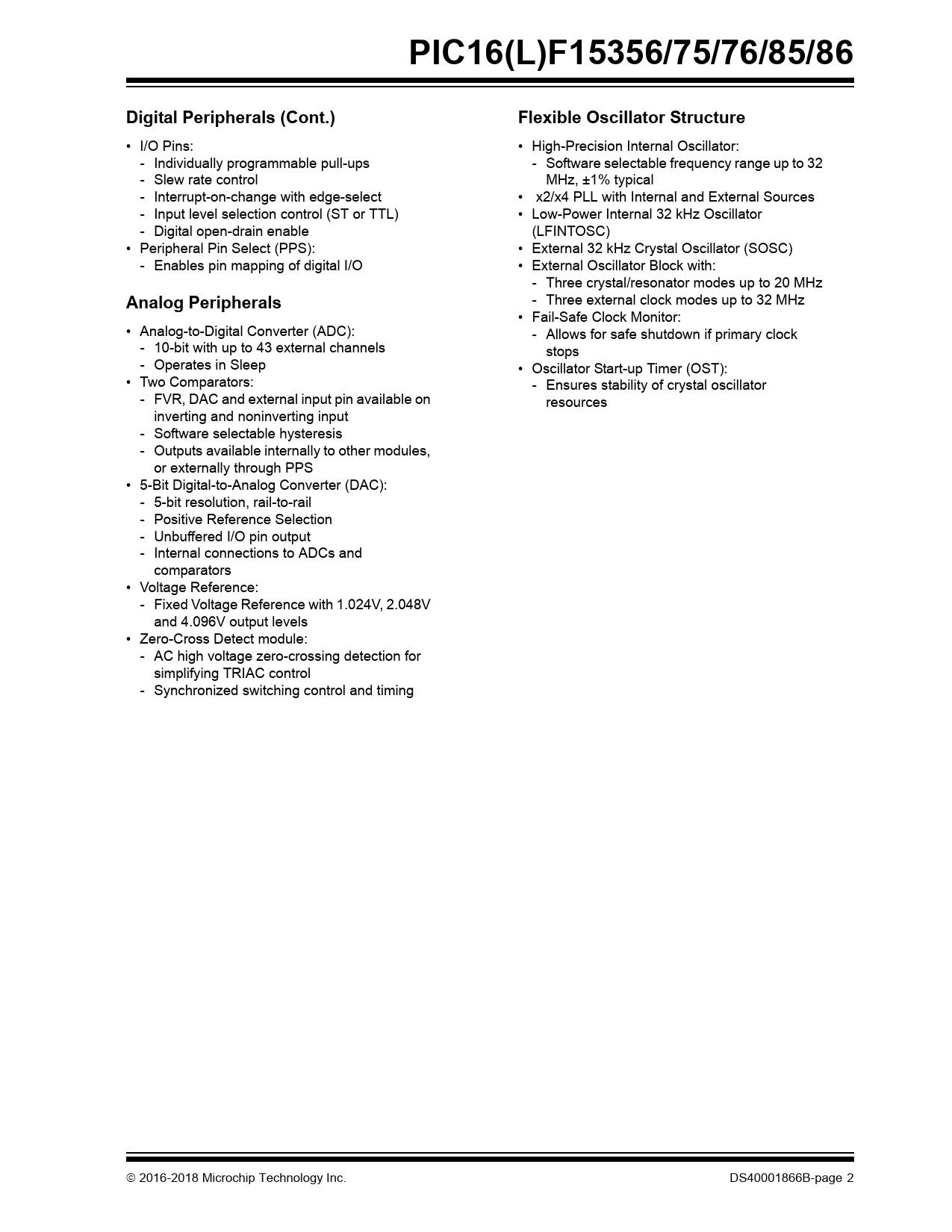 PIC16(L)F15356/75/76/85/86. Digital Peripherals (Cont.). Flexible Oscillator Structure. Analog Peripherals