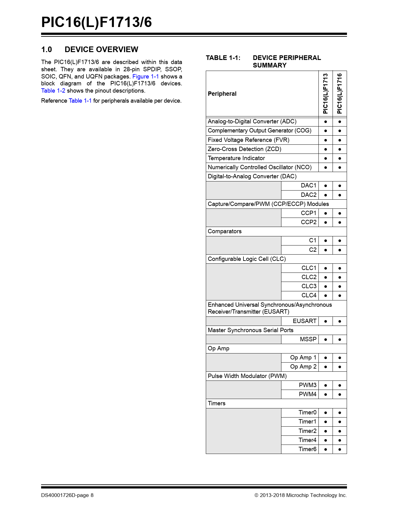 PIC16(L)F1713/6. 1.0. DEVICE OVERVIEW. TABLE 1-1:. DEVICE PERIPHERAL. SUMMARY. 713. 716. Peripheral. (L)F1. C16