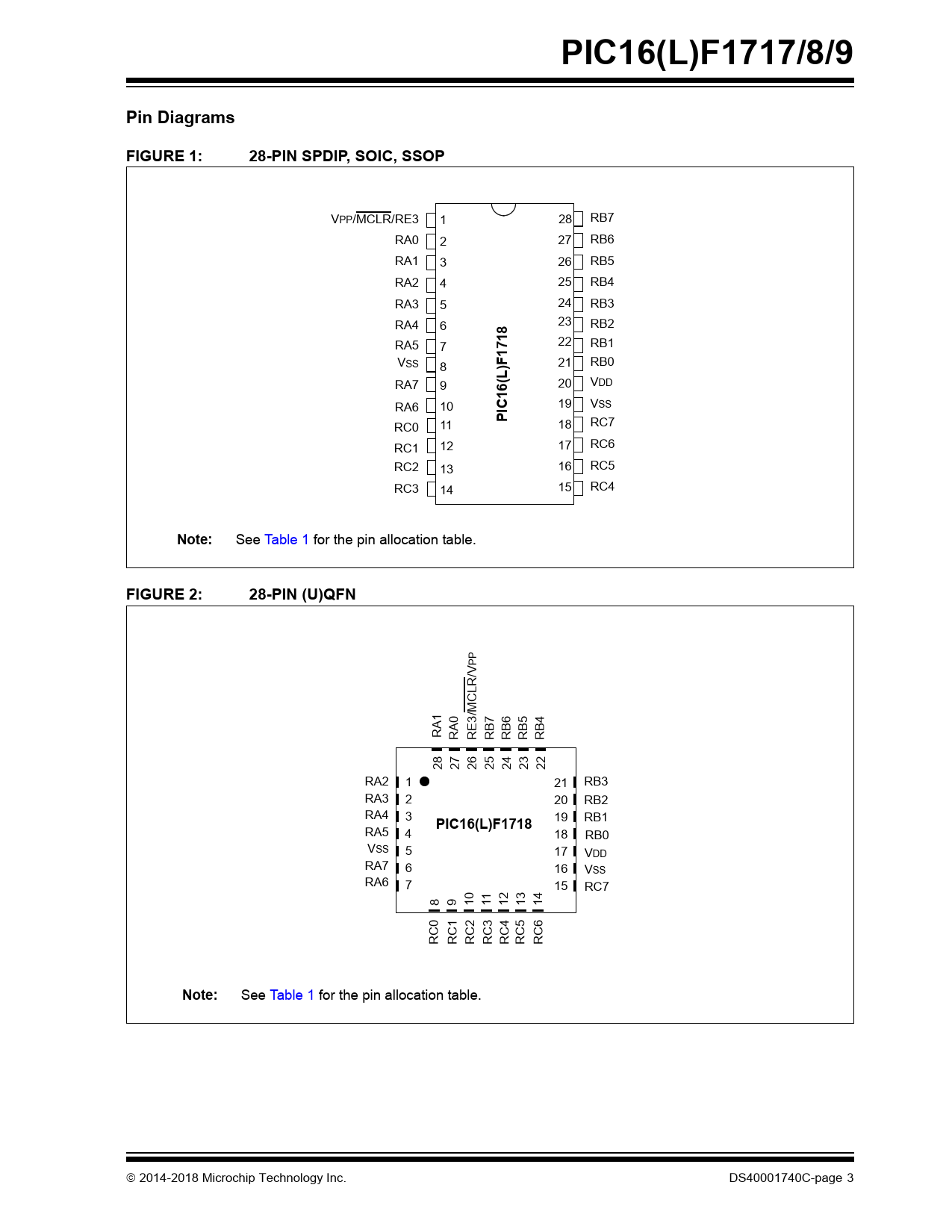 PIC16(L)F1717/8/9. Pin Diagrams. FIGURE 1:. 28-PIN SPDIP, SOIC, SSOP. 718. (L)F1. C16. Note:. FIGURE 2:. 28-PIN (U)QFN. PIC16(L)F1718