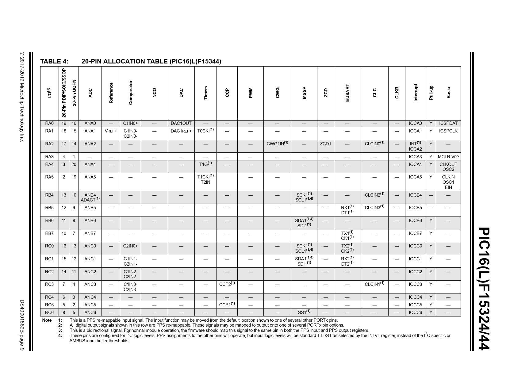 TABLE 4:. 20-PIN ALLOCATION TABLE (PIC16(L)F15344). P O. N F. OIC/SS. (2). ren. arat. rrupt. sic. I/O. in UQ. ADC. NCO. DAC. ime. CWG. ZCD. CLC. CLK. Inte. Pull-
