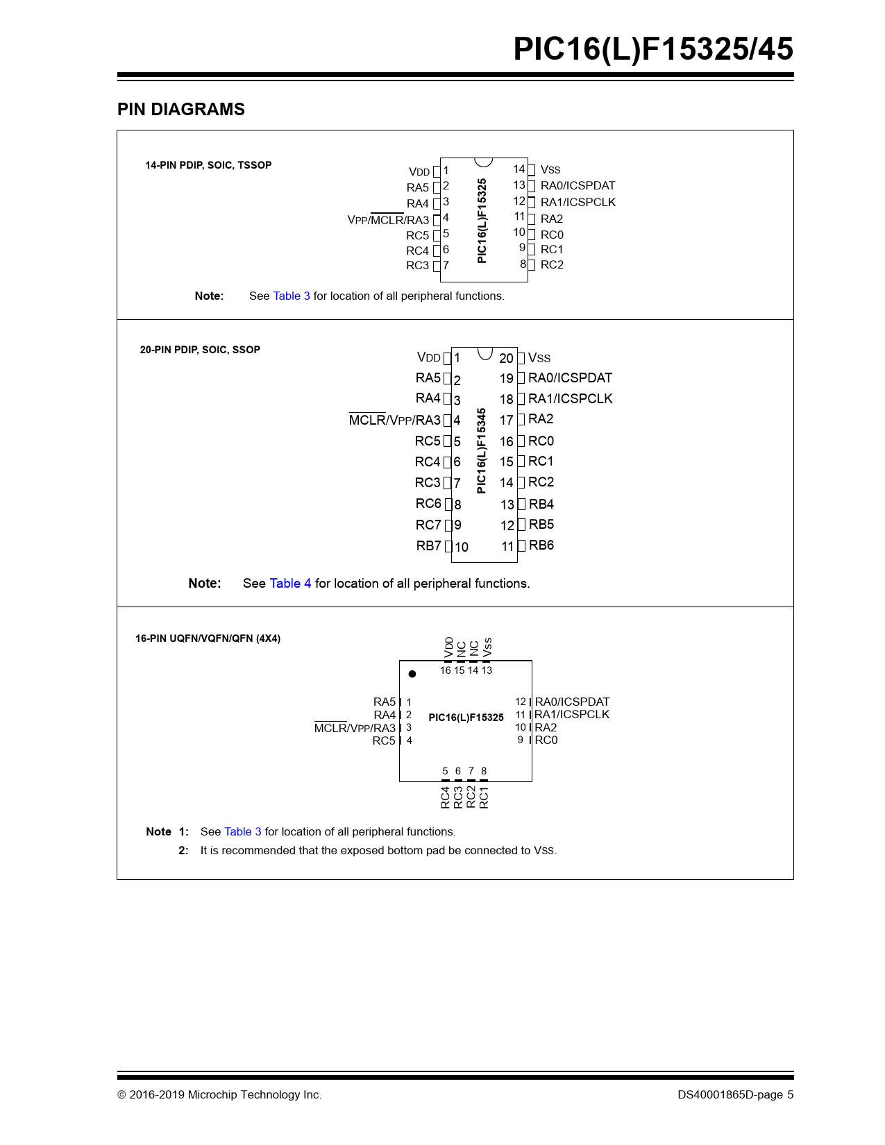 PIC16(L)F15325/45. PIN DIAGRAMS. 14-PIN PDIP, SOIC, TSSOP. F15325. PIC16(. Note:. 20-PIN PDIP, SOIC, SSOP. 345. )F15. 16(L. PIC