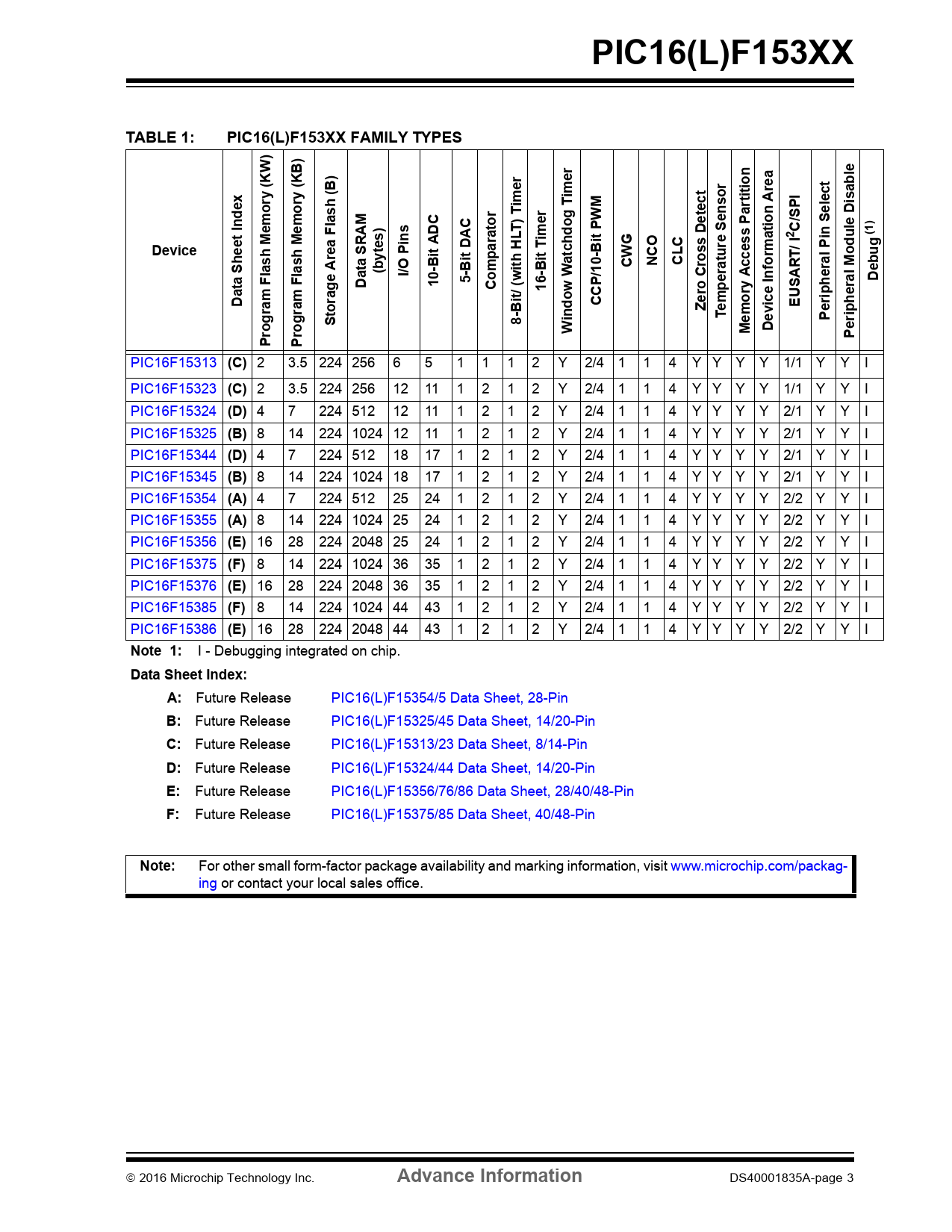 24 /3 — PIC16(L)F153XX. TABLE 1:. PIC16(L)F153XX FAMILY TYPES. ble. (KB). rea. h …