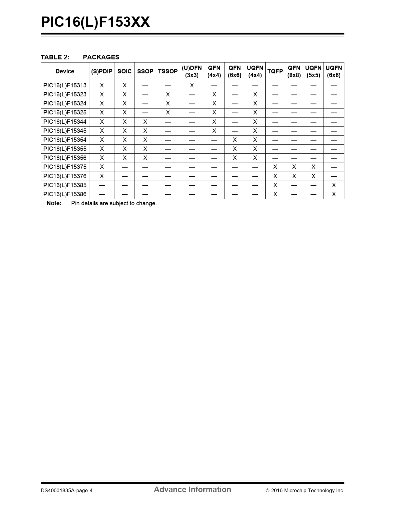PIC16(L)F153XXTABLE 2:PACKAGES(U)DFN QFNQFN UQFNQFN UQFN UQFNDevice(S)PDIP SOIC SSOP TSSOPTQFP(3x3)(4x4)(6x6)(4x4)(8x8) (5x5)(6x6) PIC16(L)F15313 X X — — X — — — — — — — PIC16(L)F15323 X X — X — X — X — — — — PIC16(L)F15324 X X — X — X — X — — — — PIC16(L)F15325 X X — X — X — X — — — — PIC16(L)F15344 X X X — — X — X — — — — PIC16(L)F15345 X X X — — X — X — — — — PIC16(L)F15354 X X X — — — X X — — — — PIC16(L)F15355 X X X — — — X X — — — — PIC16(L)F15356 X X X — — — X X — — — — PIC16(L)F15375 X — — — — — — — X X X — PIC16(L)F15376 X — — — — — — — X X X — PIC16(L)F15385 — — — — — — — — X — — X PIC16(L)F15386 — — — — — — — — X — — X Note: Pin details are subject to change. DS40001835A-page 4 Advance Information 2016 Microchip Technology Inc. Document Outline Description Core Features Memory Operating Characteristics Power-Saving Functionality eXtreme Low-Power (XLP) Features Digital Peripherals Analog Peripherals Flexible Oscillator Structure TABLE 1: PIC16(L)F153XX Family Types TABLE 2: Packages Pin Diagrams FIGURE 1: 8-Pin PDIP, SOIC, MSOP, for PIC16(L)F15313 FIGURE 2: 14-Pin PDIP, SOIC, TSSOP for PIC16(L)F15323 FIGURE 3: 14-Pin PDIP, TSSOP for PIC16(L)F15324 and PIC16(L)F15325 FIGURE 4: 20-Pin PDIP, SOIC, SSOP for PIC16(L)F15344, PIC16(L)F15345 FIGURE 5: 28-Pin PDIP, SOIC, SSOP for PIC16(L)F15354, PIC16(L)F15355, PIC16(L)F15356 FIGURE 6: 40-Pin PDIP for PIC16(L)F15375, PIC16(L)F15376 FIGURE 7: 16-Pin QFN/UQFN (4x4) for PIC16(L)F15323, PIC16(L)F15324, PIC16(L)F15325 FIGURE 8: 20-Pin QFN/UQFN (4x4) for PIC16(L)F15344 and PIC16(L)F15345 FIGURE 9: 28-Pin UQFN (4x4) for PIC16(L)F15354, PIC16(L)F15355, PIC16(L)F15356 FIGURE 10: 28-Pin QFN (6x6) for PIC16(L)F15354, PIC16(L)F15355, PIC16(L)F15356 FIGURE 11: 40-Pin UQFN (5x5) for PIC16(L)F15375, PIC16(L)F15376 FIGURE 12: 44-Pin TQFP (10x10) for PIC16(L)F15375, PIC16(L)F15376 FIGURE 13: 44-Pin QFN (8x8x0.9) for PIC16(L)F15375, PIC16(L)F15376 FIGURE 14: 48-Pin UQFN (6x6) for PIC16(L)F15385, PIC16(L)F15386 FIGURE 15: 48-Pin TQFP (7x7) for PIC16(L)F15385, PIC16(L)F15386 Pin Allocation Tables TABLE 3: 8-Pin Allocation Table (PIC16(L)F15313) TABLE 4: 14/16/20-Pin Allocation Table (PIC16(L)F15323, PIC16(L)F15324, PIC16(L)F15325, PIC16(L)F15344, PIC16(L)F15345) TABLE 5: 28-Pin Allocation Table (PIC16(L)F15354, PIC16(L)F15355, PIC16(L)F15356) TABLE 6: 40/44-Pin Allocation Table (PIC16(L)F15375, PIC16(L)F15376) TABLE 7: 48-Pin Allocation Table (PIC16(L)F15385, PIC16(L)F15386) Trademarks Worldwide Sales