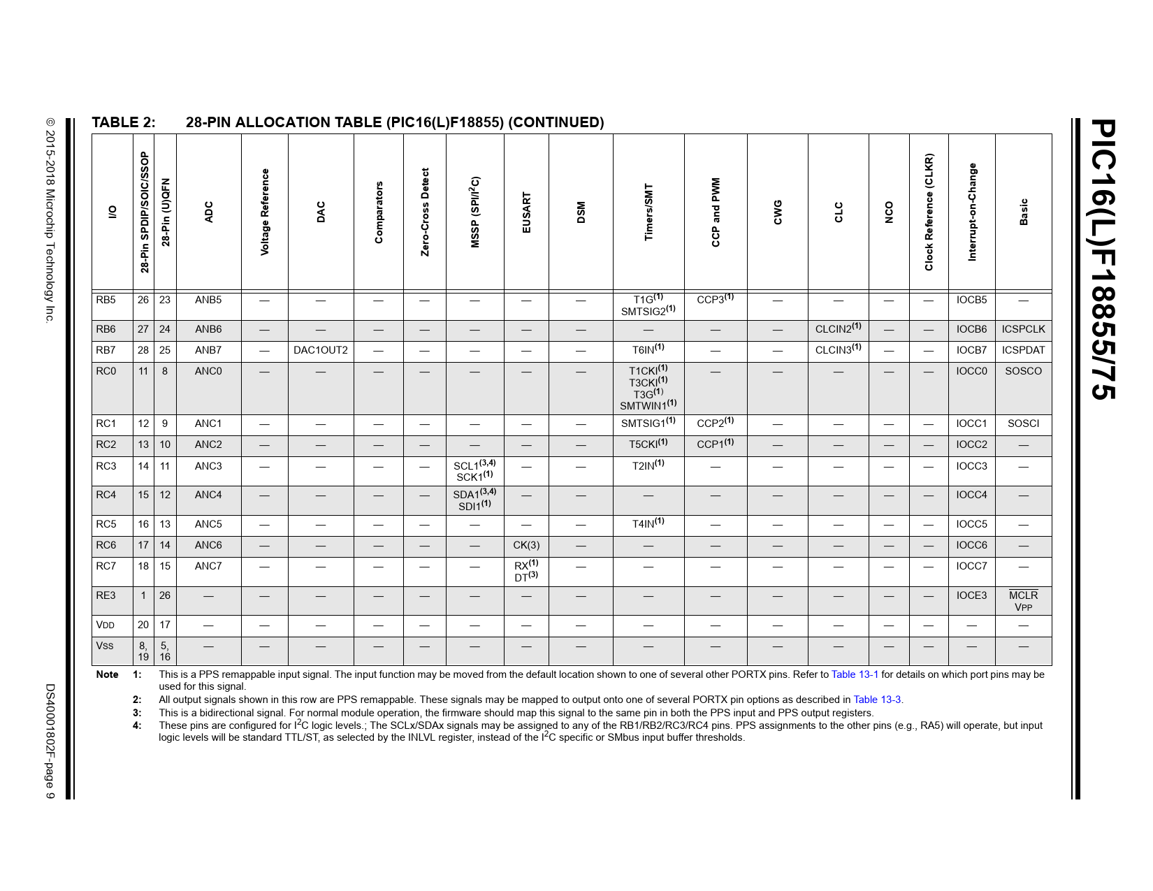 TABLE 2: 28-PIN ALLOCATION TABLE (PIC16(L)F18855) (CONTINUED)
