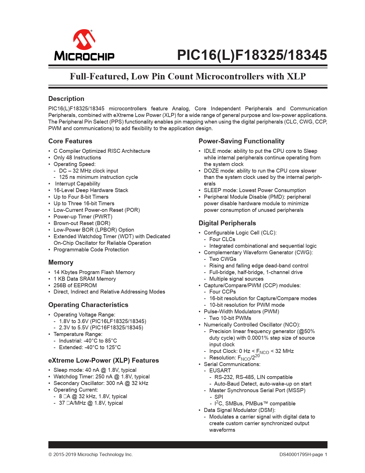 PIC16(L)F18325/18345. Full-Featured, Low Pin Count Microcontrollers with XLP. Description. Core Features