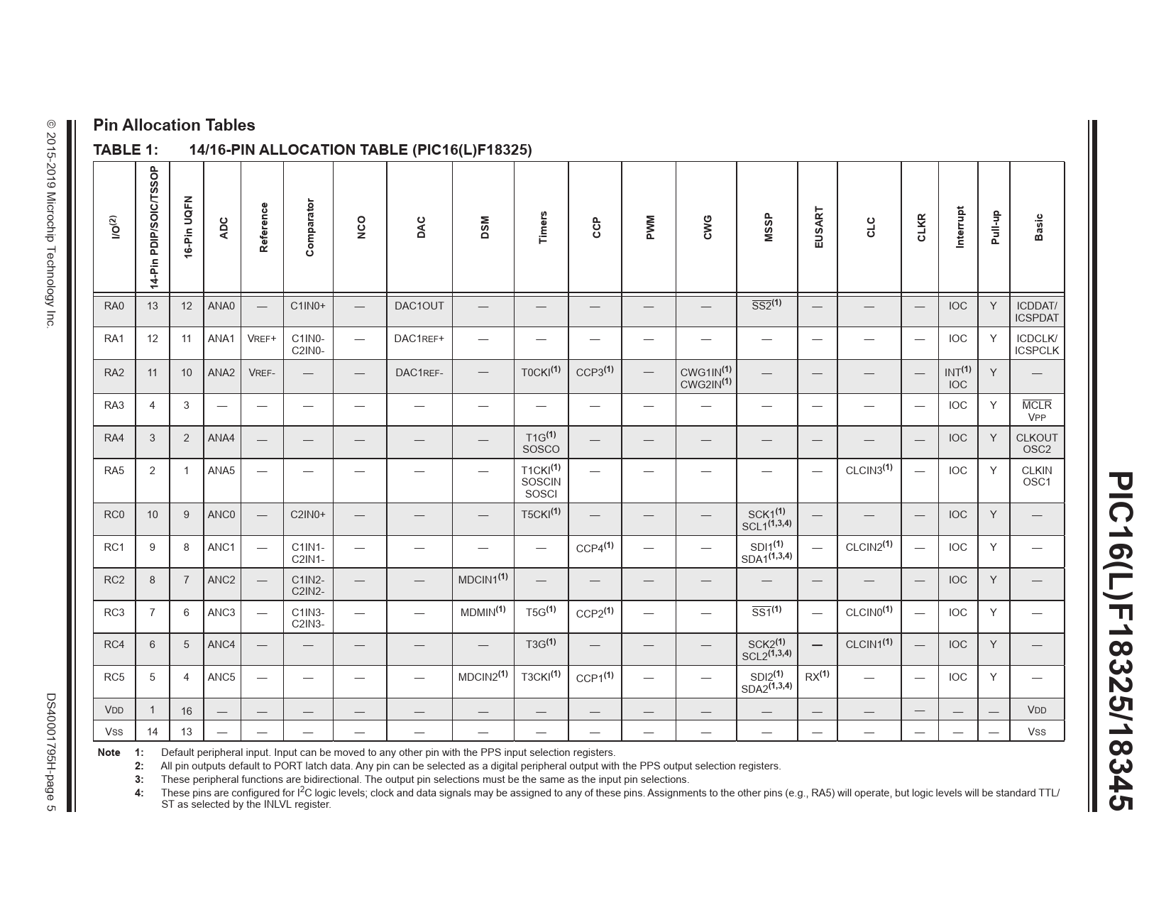 Pin Allocation Tables TABLE 1:. 14/16-PIN ALLOCATION TABLE (PIC16(L)F18325). (2). I/O. ADC. NCO. DAC. DSM. imers. CCP. CLC. PWM. CWG. MSSP. CLKR