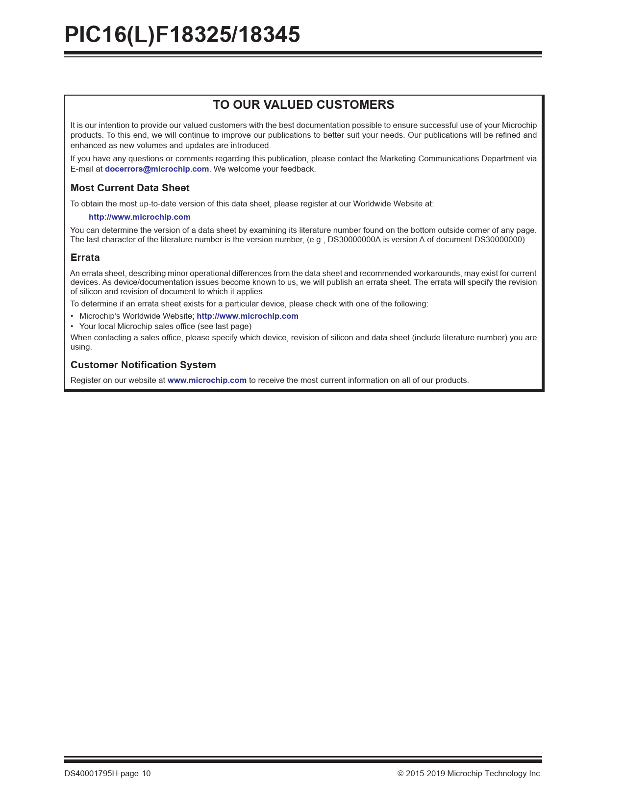 PIC16(L)F18325/18345. TO OUR VALUED CUSTOMERS. docerrors@microchip.com. Most Current Data Sheet. http://www.microchip.com. Errata