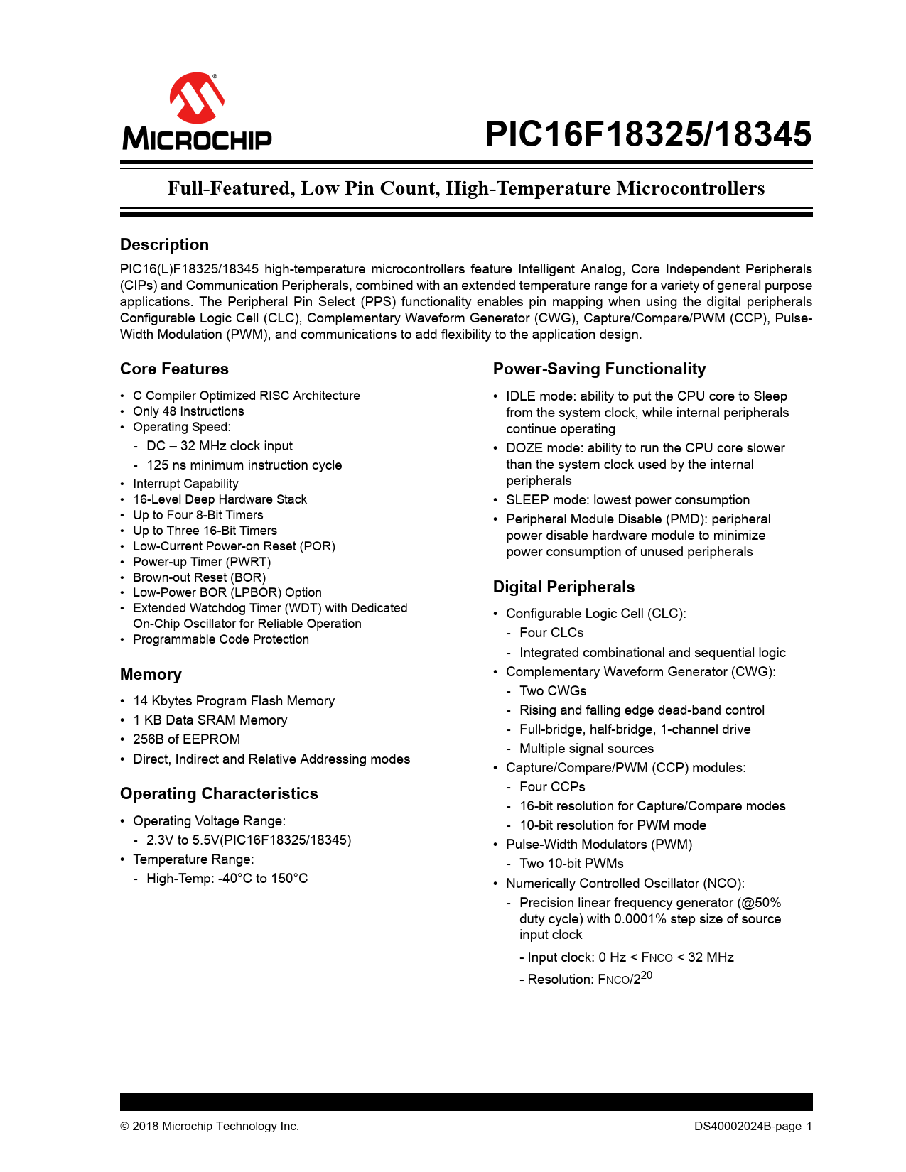 PIC16F18325/18345Full-Featured, Low Pin Count, High-Temperature MicrocontrollersDescription PIC16(L)F18325/18345 high-temperature microcontrollers feature Intelligent Analog, Core Independent Peripherals (CIPs) and Communication Peripherals, combined with an extended temperature range for a variety of general purpose applications. The Peripheral Pin Select (PPS) functionality enables pin mapping when using the digital peripherals Configurable Logic Cell (CLC), Complementary Waveform Generator (CWG), Capture/Compare/PWM (CCP), Pulse- Width Modulation (PWM), and communications to add flexibility to the application design. Core FeaturesPower-Saving Functionality • C Compiler Optimized RISC Architecture • IDLE mode: ability to put the CPU core to Sleep • Only 48 Instructions from the system clock, while internal peripherals • Operating Speed: continue operating - DC – 32 MHz clock input • DOZE mode: ability to run the CPU core slower - 125 ns minimum instruction cycle than the system clock used by the internal • Interrupt Capability peripherals • 16-Level Deep Hardware Stack • SLEEP mode: lowest power consumption • Up to Four 8-Bit Timers • Peripheral Module Disable (PMD): peripheral • Up to Three 16-Bit Timers power disable hardware module to minimize • Low-Current Power-on Reset (POR) power consumption of unused peripherals • Power-up Timer (PWRT) • Brown-out Reset (BOR) • Low-Power BOR (LPBOR) Option Digital Peripherals • Extended Watchdog Timer (WDT) with Dedicated • Configurable Logic Cell (CLC): On-Chip Oscil ator for Reliable Operation • Programmable Code Protection - Four CLCs - Integrated combinational and sequential logic Memory • Complementary Waveform Generator (CWG): - Two CWGs • 14 Kbytes Program Flash Memory - Rising and falling edge dead-band control • 1 KB Data SRAM Memory - Full-bridge, half-bridge, 1-channel drive • 256B of EEPROM - Multiple signal sources • Direct, Indirect and Relative Addressing modes • Capture/Compare/PWM (CCP) modules: Operating Characteristics - Four CCPs - 16-bit resolution for Capture/Compare modes • Operating Voltage Range: - 10-bit resolution for PWM mode - 2.3V to 5.5V(PIC16F18325/18345) • Pulse-Width Modulators (PWM) • Temperature Range: - Two 10-bit PWMs - High-Temp: -40°C to 150°C • Numerically Controlled Oscillator (NCO): - Precision linear frequency generator (@50% duty cycle) with 0.0001% step size of source input clock - Input clock: 0 Hz < FNCO < 32 MHz - Resolution: FNCO/220 2018 Microchip Technology Inc. DS40002024B-page 1 Document Outline PIC16F18325/18345 Family Types Table of Contents 1.0 Device Overview 2.0 Device/Revision ID Registers Register 2-1: DEVID: Device ID Register Register 2-2: REVID: Revision ID Register 2 3.0 Electrical Characteristics TABLE 3-1: Supply Voltage (High Temperature) FIGURE 3-1: Voltage-Frequency Graph, -40°C £ Ta £ +150°C TABLE 3-2: DC Characteristics: Supply Current (1,2) TABLE 3-3: DC Characteristics: Power-Down Currents (IPD)(1,2,3) TABLE 3-4: Internal Oscillator Parameters(1) FIGURE 3-2: Precision-Calibrated HFINTOSC Frequency Accuracy Over Device Vdd and Temperature TABLE 3-5: Reset, Watchdog Timer, Oscillator Start-up Timer, Power-up Timer, Brown-out Timer and Low-Power Brown-out Reset Specifications Appendix A: Revision History The Microchip WebSite Customer Change Notification Service Customer Support Product Identification System Trademarks Worldwide Sales