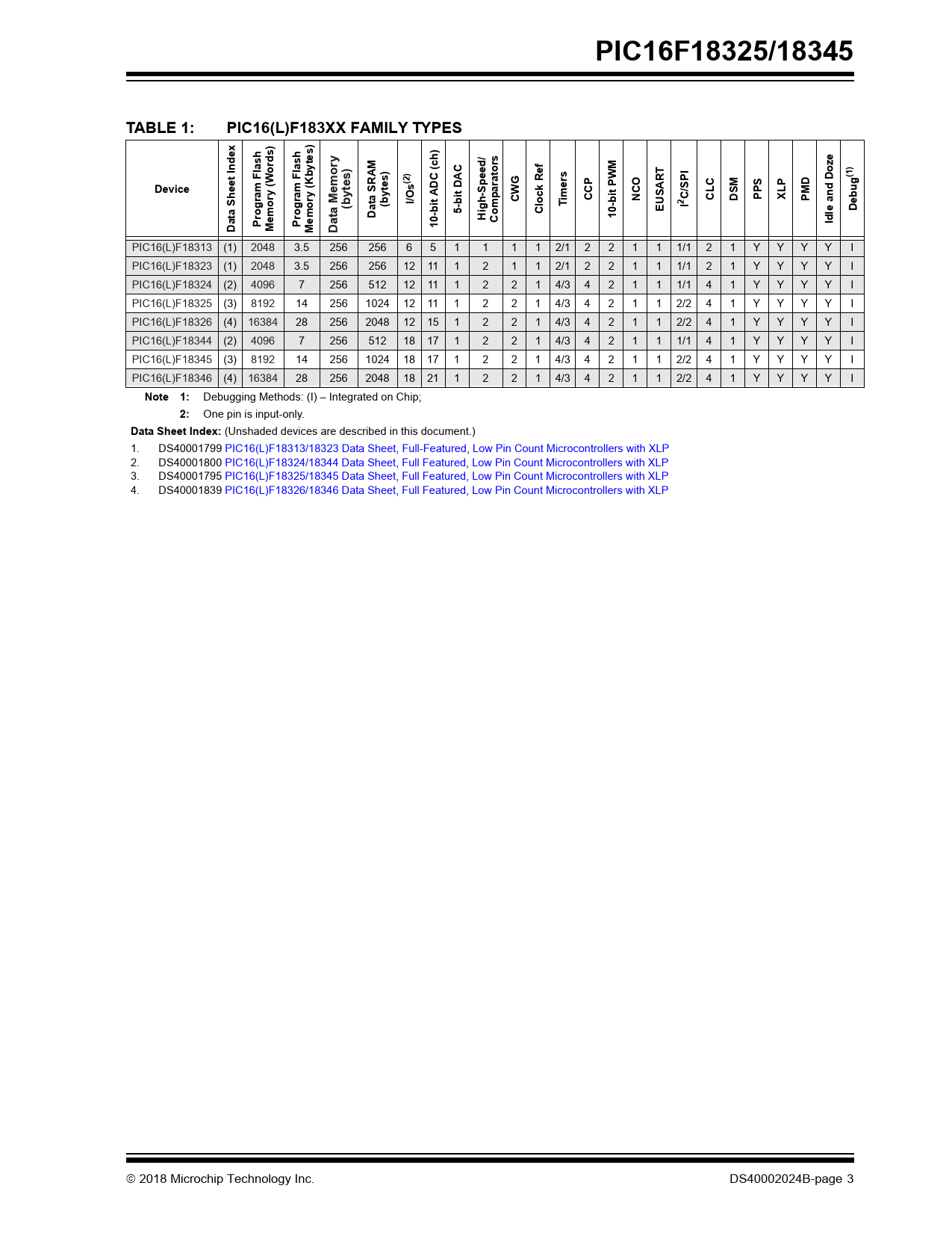 PIC16F18325/18345. TABLE 1:. PIC16(L)F183XX FAMILY TYPES. rds). Index. (ch). (1). (2). ator. Device. m Fla. SRAM. t PWM. ry (K. ytes). it DAC. CWG. ime