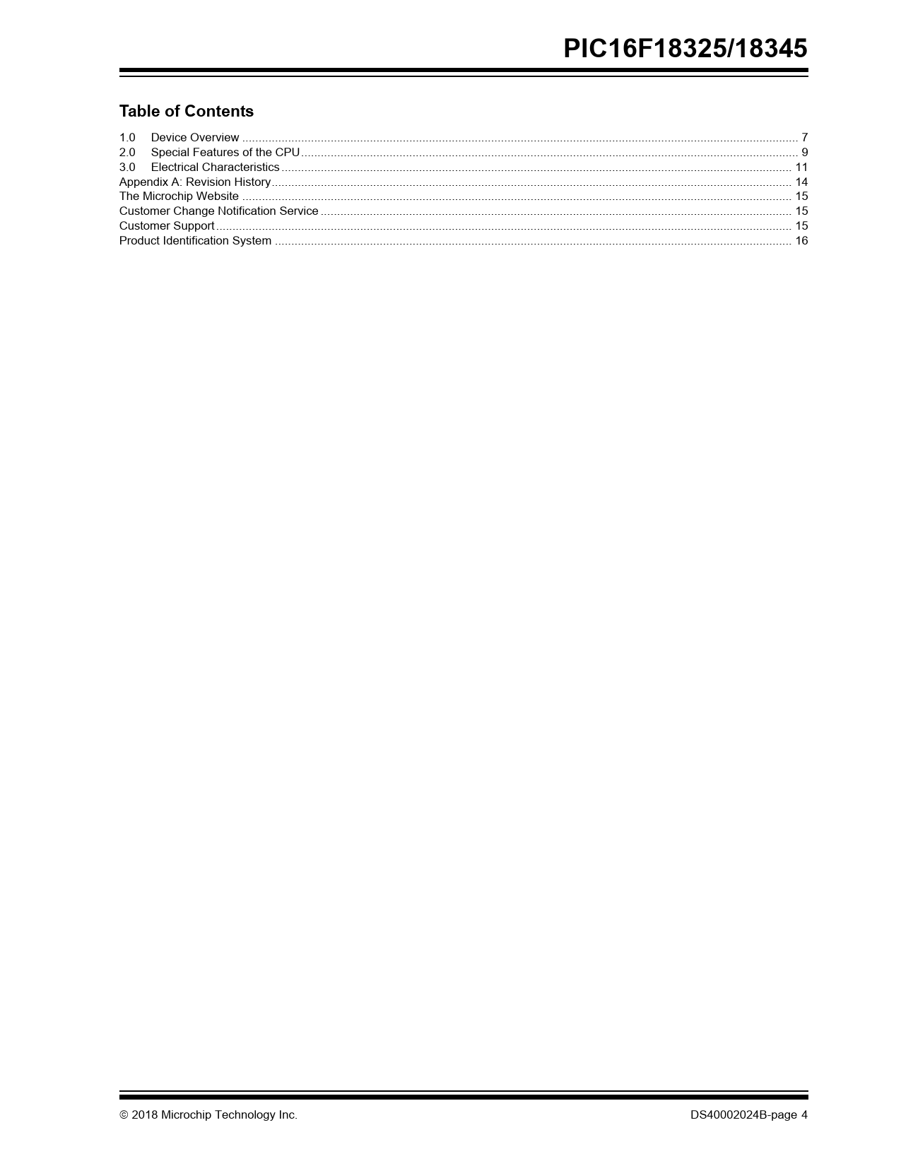 | Páginas / Página | 18 / 4 — PIC16F18325/18345. Table of Contents. 1.0 Device Overview . 7. 2.0 … |
