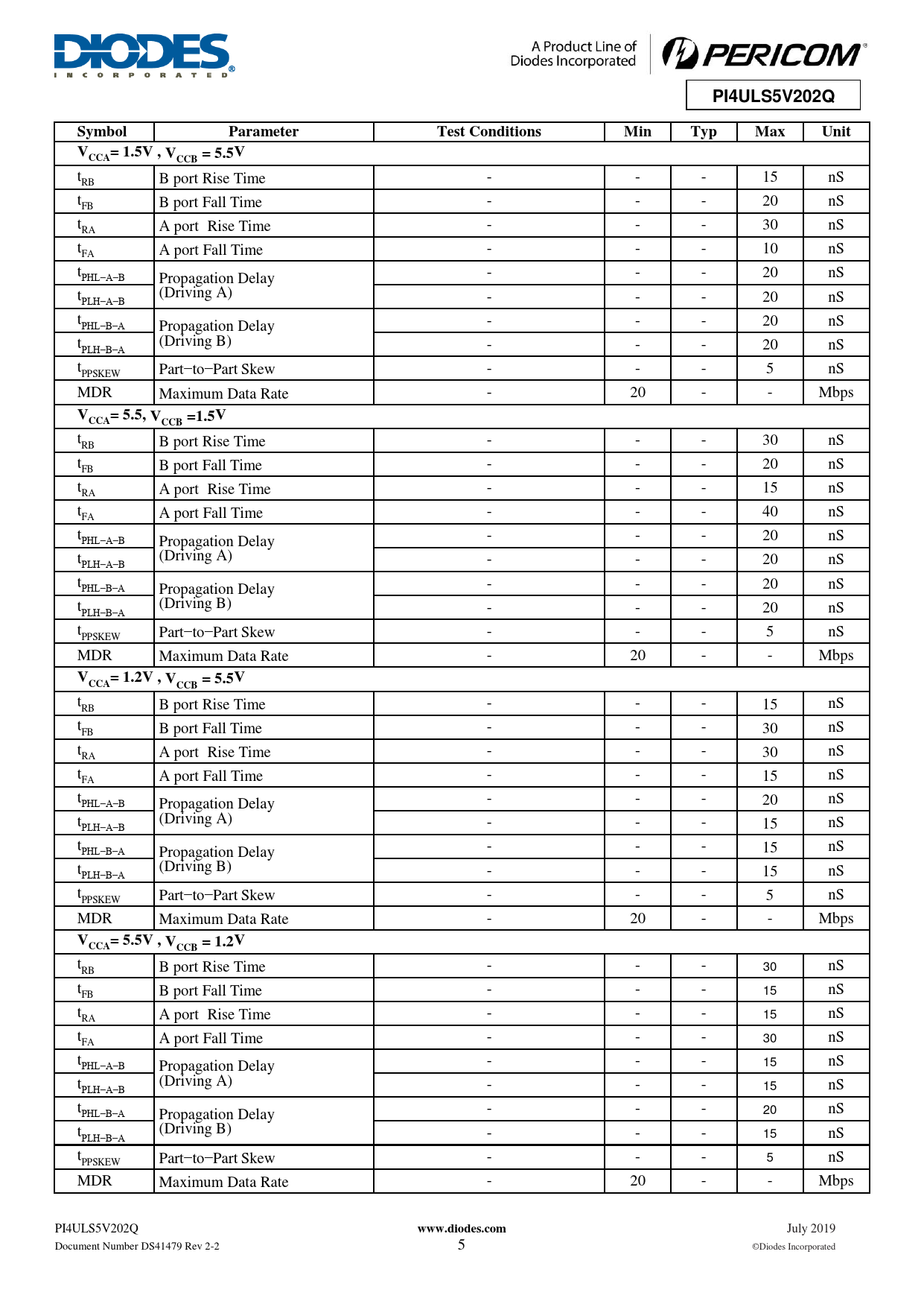PI4ULS5V202Q Symbol Parameter Test Conditions Min Typ Max Unit V = 1.5V , CCA VCCB = 5.5V