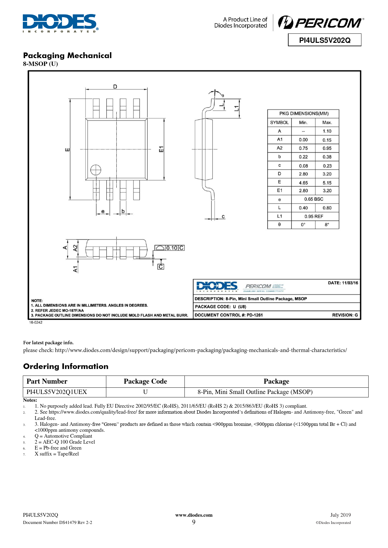 PI4ULS5V202Q. Packaging Mechanical. 8-MSOP (U). Ordering Information. Part Number. Package Code. Package. Notes:. www.diodes.com