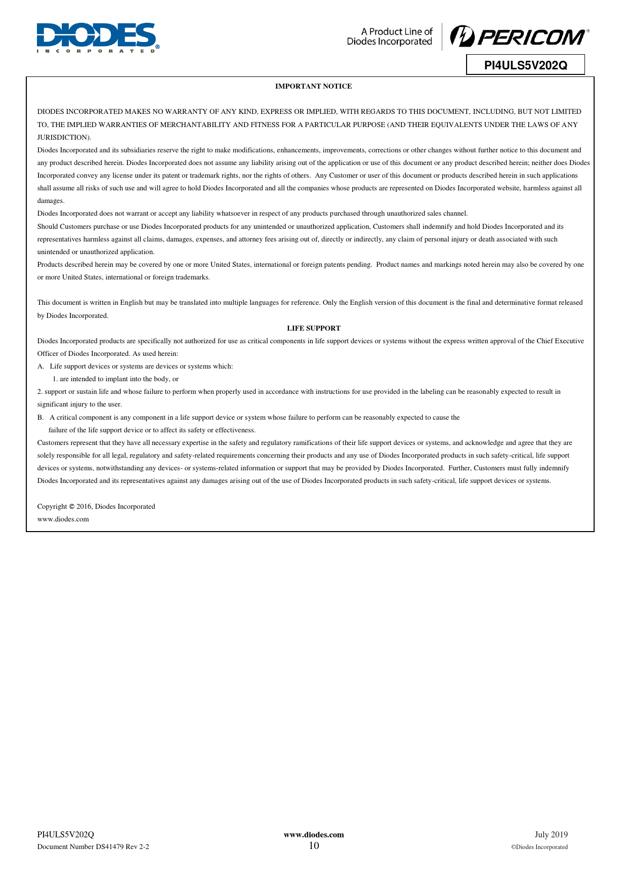 PI4ULS5V202Q. IMPORTANT NOTICE. LIFE SUPPORT. www.diodes.com
