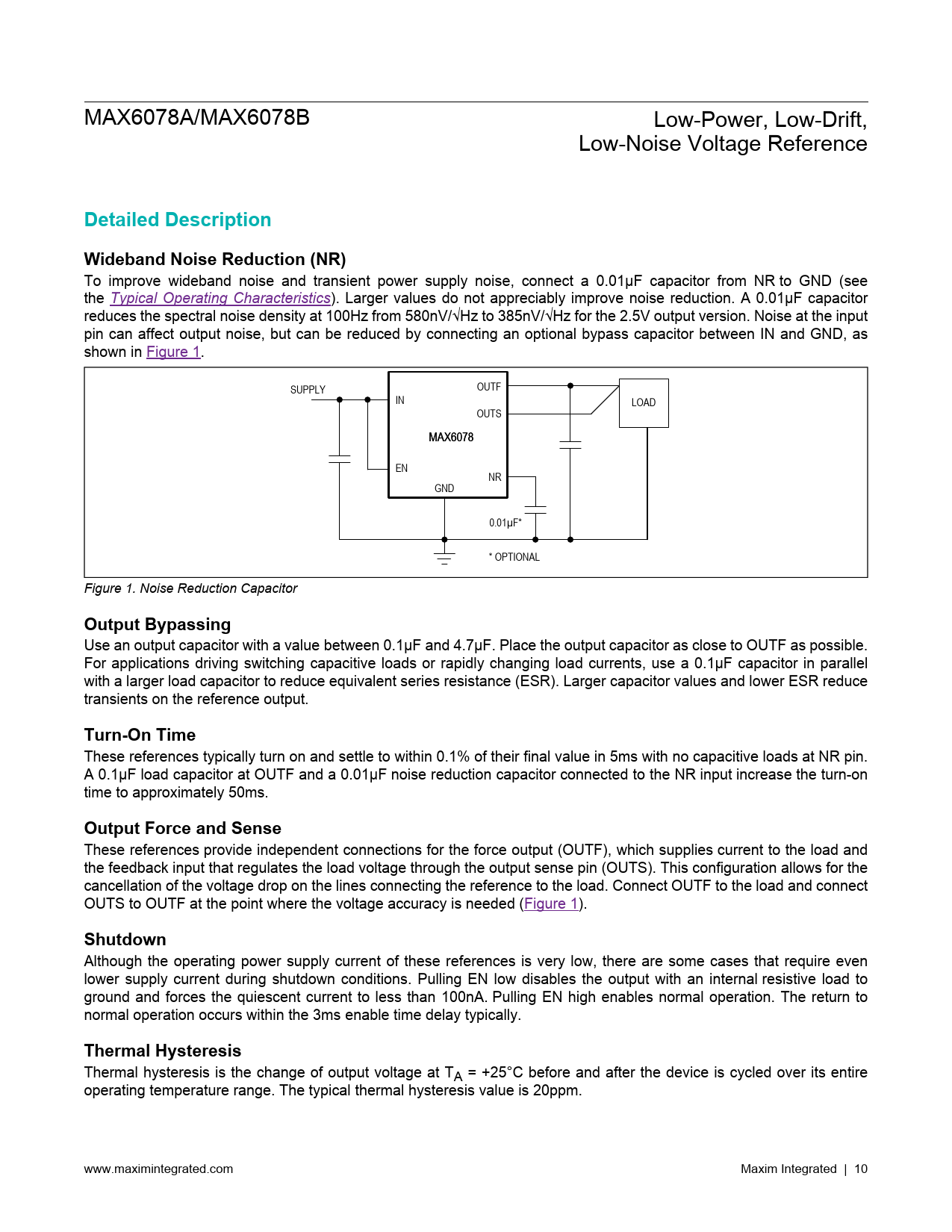 Detailed Description. Wideband Noise Reduction (NR). Output Bypassing. Turn-On Time. Output Force and Sense. Shutdown