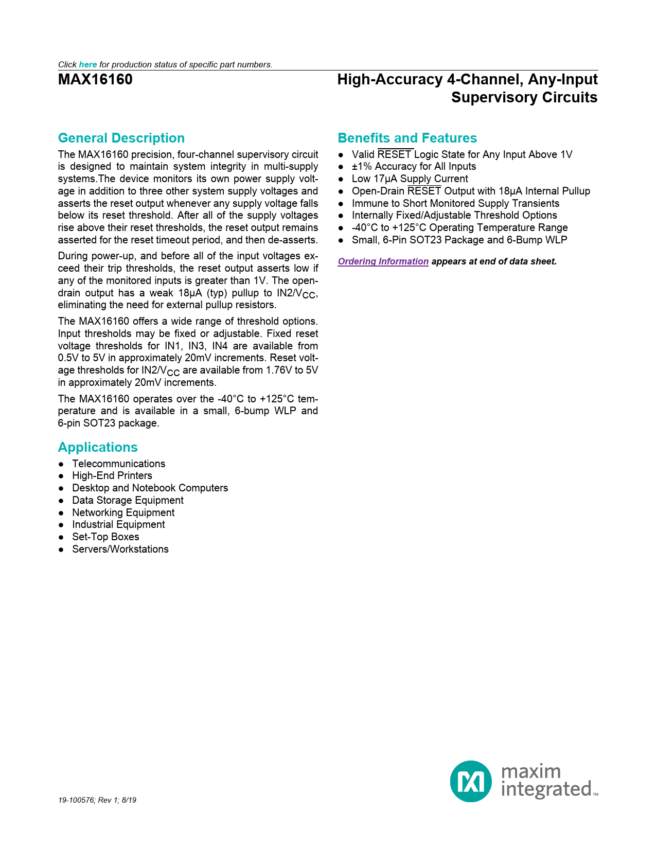 link to page 16 Click here for production status of specific part numbers. MAX16160High-Accuracy 4-Channel, Any-InputSupervisory CircuitsGeneral DescriptionBenefits and Features The MAX16160 precision, four-channel supervisory circuit ● Valid RESET Logic State for Any Input Above 1V is designed to maintain system integrity in multi-supply ● ±1% Accuracy for All Inputs systems.The device monitors its own power supply volt- ● Low 17µA Supply Current age in addition to three other system supply voltages and ● Open-Drain RESET Output with 18μA Internal Pullup asserts the reset output whenever any supply voltage falls ● Immune to Short Monitored Supply Transients below its reset threshold. After all of the supply voltages ● Internally Fixed/Adjustable Threshold Options rise above their reset thresholds, the reset output remains ● -40°C to +125°C Operating Temperature Range asserted for the reset timeout period, and then de-asserts. ● Small, 6-Pin SOT23 Package and 6-Bump WLP During power-up, and before all of the input voltages ex- Ordering Informationappears at end of data sheet. ceed their trip thresholds, the reset output asserts low if any of the monitored inputs is greater than 1V. The open- drain output has a weak 18μA (typ) pullup to IN2/VCC, eliminating the need for external pullup resistors. The MAX16160 offers a wide range of threshold options. Input thresholds may be fixed or adjustable. Fixed reset voltage thresholds for IN1, IN3, IN4 are available from 0.5V to 5V in approximately 20mV increments. Reset volt- age thresholds for IN2/VCC are available from 1.76V to 5V in approximately 20mV increments. The MAX16160 operates over the -40°C to +125°C tem- perature and is available in a small, 6-bump WLP and 6-pin SOT23 package. Applications ● Telecommunications ● High-End Printers ● Desktop and Notebook Computers ● Data Storage Equipment ● Networking Equipment ● Industrial Equipment ● Set-Top Boxes ● Servers/Workstations 19-100576; Rev 1; 8/19 Document Outline General Description Applications Benefits and Features Typical Operating Circuit Absolute Maximum Ratings Package Information 6 SOT23 6 WLP Electrical Characteristics Typical Operating Characteristics Typical Operating Characteristics (continued) Pin Configurations 6 SOT23 6 WLP Pin Description Pin Description (continued) Block Diagrams Internally Fixed Threshold Block Diagrams (continued) Adjustable Threshold Detailed Description Reset Output Input Hysteresis Input Thresholds Applications Information Adjustable Threshold Inputs (IN1, IN3, IN4) Adding Manual Reset Capability Unused Inputs Power-Supply Bypassing Selector Guide Typical Application Circuit Ordering Information Revision History