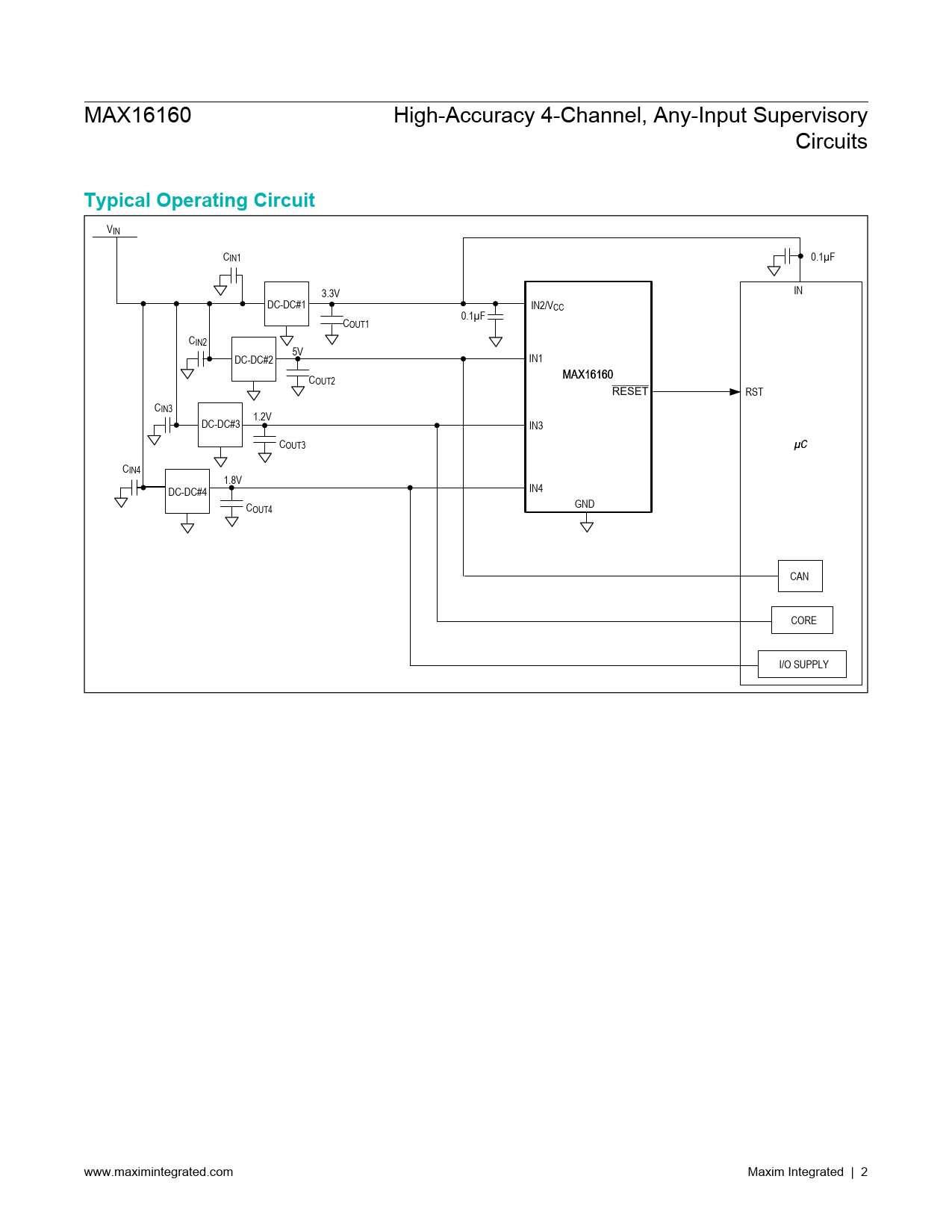 VIN CIN1 0.1µF IN 3.3V DC-DC#1 IN2/VCC 0.1µF COUT1 CIN2 5V DC-DC#2 IN1 MAX16160 COUT2 RESET RST CIN3 1.2V DC-DC#3 IN3 COUT3 µC CIN4 1.8V IN4 DC-DC#4 GND COUT4 CAN CORE I/O SUPPLY www.maximintegrated.com Maxim Integrated | 2 Document Outline General Description Applications Benefits and Features Typical Operating Circuit Absolute Maximum Ratings Package Information 6 SOT23 6 WLP Electrical Characteristics Typical Operating Characteristics Typical Operating Characteristics (continued) Pin Configurations 6 SOT23 6 WLP Pin Description Pin Description (continued) Block Diagrams Internally Fixed Threshold Block Diagrams (continued) Adjustable Threshold Detailed Description Reset Output Input Hysteresis Input Thresholds Applications Information Adjustable Threshold Inputs (IN1, IN3, IN4) Adding Manual Reset Capability Unused Inputs Power-Supply Bypassing Selector Guide Typical Application Circuit Ordering Information Revision History