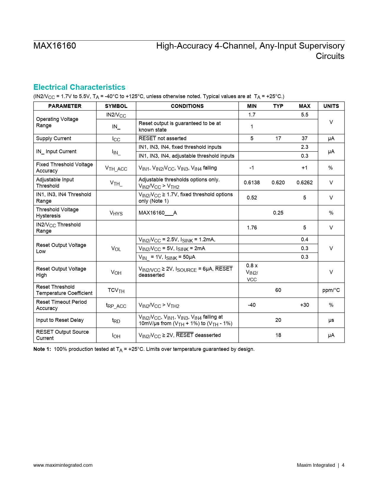 100% production tested at TA = +25°C. Limits over temperature guaranteed by design. www.maximintegrated.com Maxim Integrated | 4 Document Outline General Description Applications Benefits and Features Typical Operating Circuit Absolute Maximum Ratings Package Information 6 SOT23 6 WLP Electrical Characteristics Typical Operating Characteristics Typical Operating Characteristics (continued) Pin Configurations 6 SOT23 6 WLP Pin Description Pin Description (continued) Block Diagrams Internally Fixed Threshold Block Diagrams (continued) Adjustable Threshold Detailed Description Reset Output Input Hysteresis Input Thresholds Applications Information Adjustable Threshold Inputs (IN1, IN3, IN4) Adding Manual Reset Capability Unused Inputs Power-Supply Bypassing Selector Guide Typical Application Circuit Ordering Information Revision History