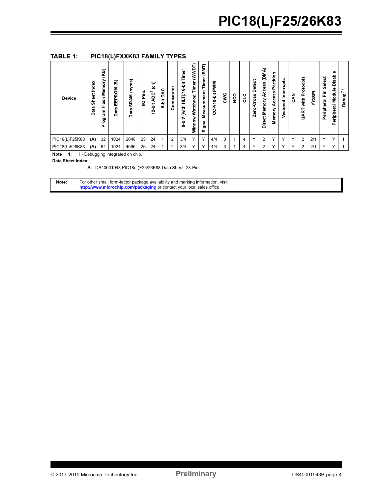 PIC18(L)F25/26K83. TABLE 1:. PIC18(L)FXXK83 FAMILY TYPES. r e. MT). MA). r (S. ion. y (KB). t T. (WWDT). rtit. ytes). upt. Select. Index. (ch). imer. le Di