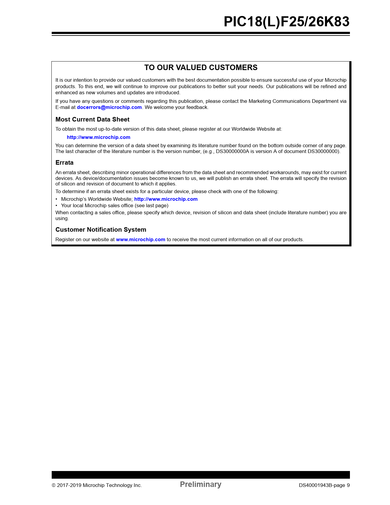 PIC18(L)F25/26K83. TO OUR VALUED CUSTOMERS. docerrors@microchip.com. Most Current Data Sheet. http://www.microchip.com. Errata