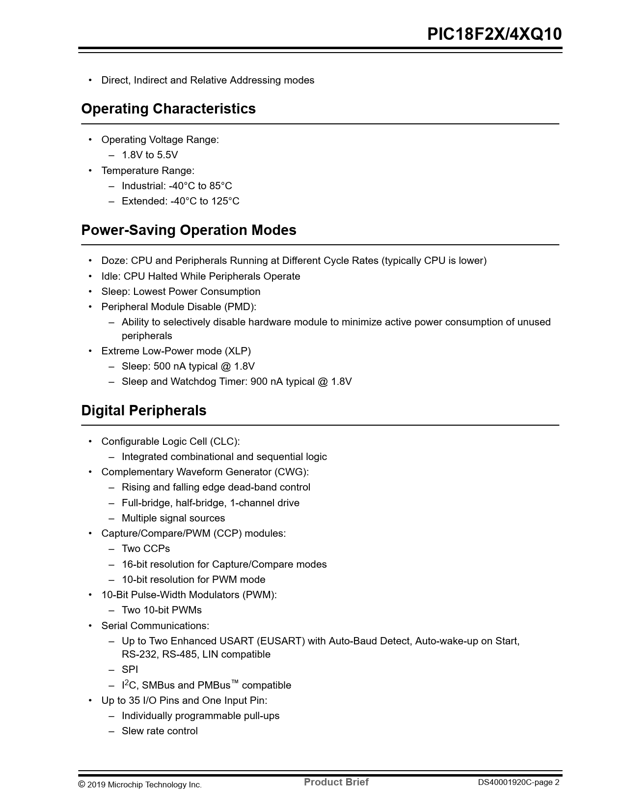 PIC18F2X/4XQ10. Operating Characteristics. Power-Saving Operation Modes. Digital Peripherals. Product Brief