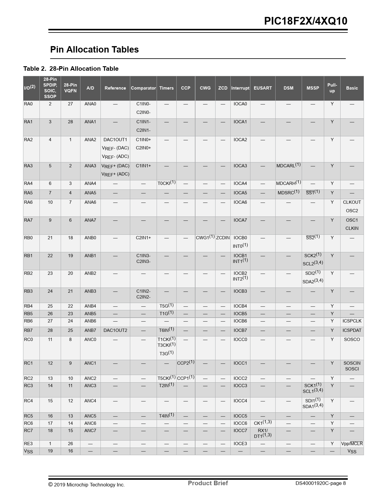 PIC18F2X/4XQ10. Pin Allocation Tables. Table 2. 28-Pin Allocation Table. 28-Pin. SPDIP,. Pull-. I/O(2). A/D