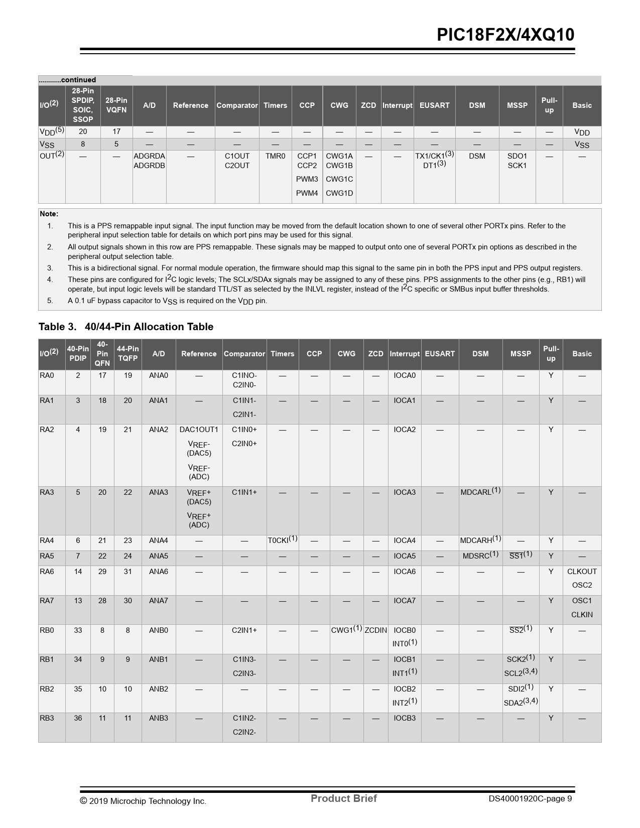 PIC18F2X/4XQ10. ...continued. 28-Pin. SPDIP,. Pull-. I/O(2). A/D. Reference Comparator Timers. CCP. CWG. ZCD Interrupt EUSART. DSM. MSSP. Basic