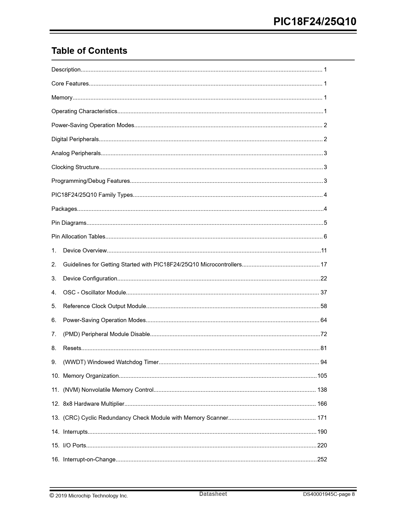 Description... 1 Core Features.. 1 Memory.. 1 Operating Characteristics...1 Power-Saving Operation Modes.. 2 Digital Peripherals.. 2 Analog Peripherals... 3 Clocking Structure.. 3 Programming/Debug Features... 3 PIC18F24/25Q10 Family Types... 4 Packages..4 Pin Diagrams..5 Pin Allocation Tables.. 6 1. Device Overview..11 2. Guidelines for Getting Started with PIC18F24/25Q10 Microcontrollers.. 17 3. Device Configuration...22 4. OSC - Oscillator Module... 37 5. Reference Clock Output Module... 58 6. Power-Saving Operation Modes... 64 7. (PMD) Peripheral Module Disable...72 8. Resets... 81 9. (WWDT) Windowed Watchdog Timer... 94 10. Memory Organization..105 11. (NVM) Nonvolatile Memory Control.. 138 12. 8x8 Hardware Multiplier.. 166 13. (CRC) Cyclic Redundancy Check Module with Memory Scanner.. 171 14. Interrupts... 190 15. I/O Ports.. 220 16. Interrupt-on-Change..252 © 2019 Microchip Technology Inc.