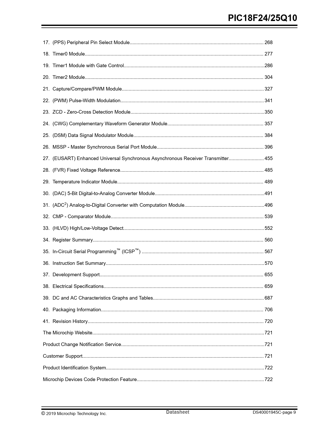 17. (PPS) Peripheral Pin Select Module... 268 18. Timer0 Module.. 277 19. Timer1 Module with Gate Control..286 20. Timer2 Module.. 304 21. Capture/Compare/PWM Module... 327 22. (PWM) Pulse-Width Modulation.. 341 23. ZCD - Zero-Cross Detection Module...350 24. (CWG) Complementary Waveform Generator Module... 357 25. (DSM) Data Signal Modulator Module.. 384 26. MSSP - Master Synchronous Serial Port Module... 396 27. (EUSART) Enhanced Universal Synchronous Asynchronous Receiver Transmitter.. 455 28. (FVR) Fixed Voltage Reference.. 485 29. Temperature Indicator Module.. 489 30. (DAC) 5-Bit Digital-to-Analog Converter Module...491 31. (ADC2) Analog-to-Digital Converter with Computation Module...496 32. CMP - Comparator Module... 539 33. (HLVD) High/Low-Voltage Detect..552 34. Register Summary.. 560 35. In-Circuit Serial Programming™ (ICSP™) .. 567 36. Instruction Set Summary...570 37. Development Support... 655 38. Electrical Specifications.. 659 39. DC and AC Characteristics Graphs and Tables.. 687 40. Packaging Information.. 706 41. Revision History.. 720 The Microchip Website...721 Product Change Notification Service..721 Customer Support.. 721 Product Identification System...722 Microchip Devices Code Protection Feature.. 722 © 2019 Microchip Technology Inc.