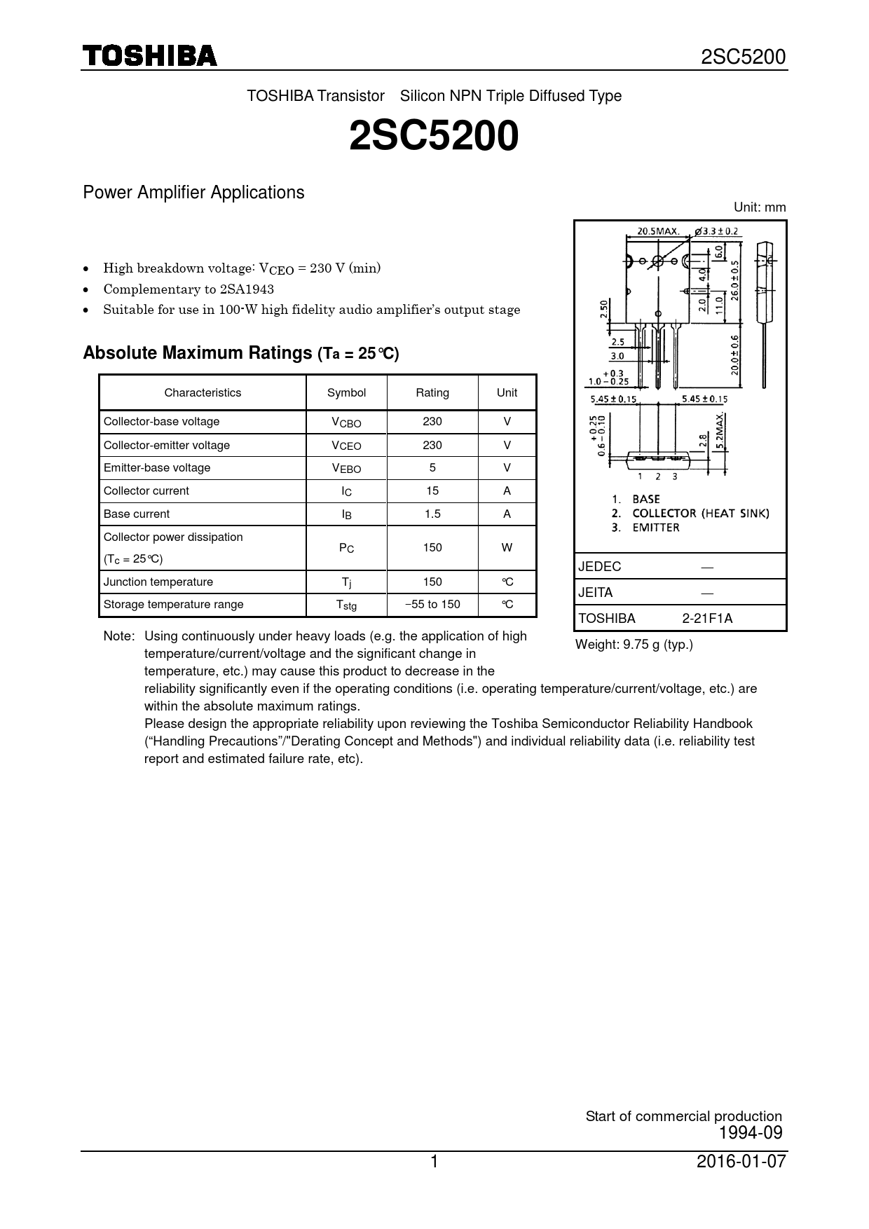 2SC5200 TOSHIBA Transistor Silicon NPN Triple Diffused Type
