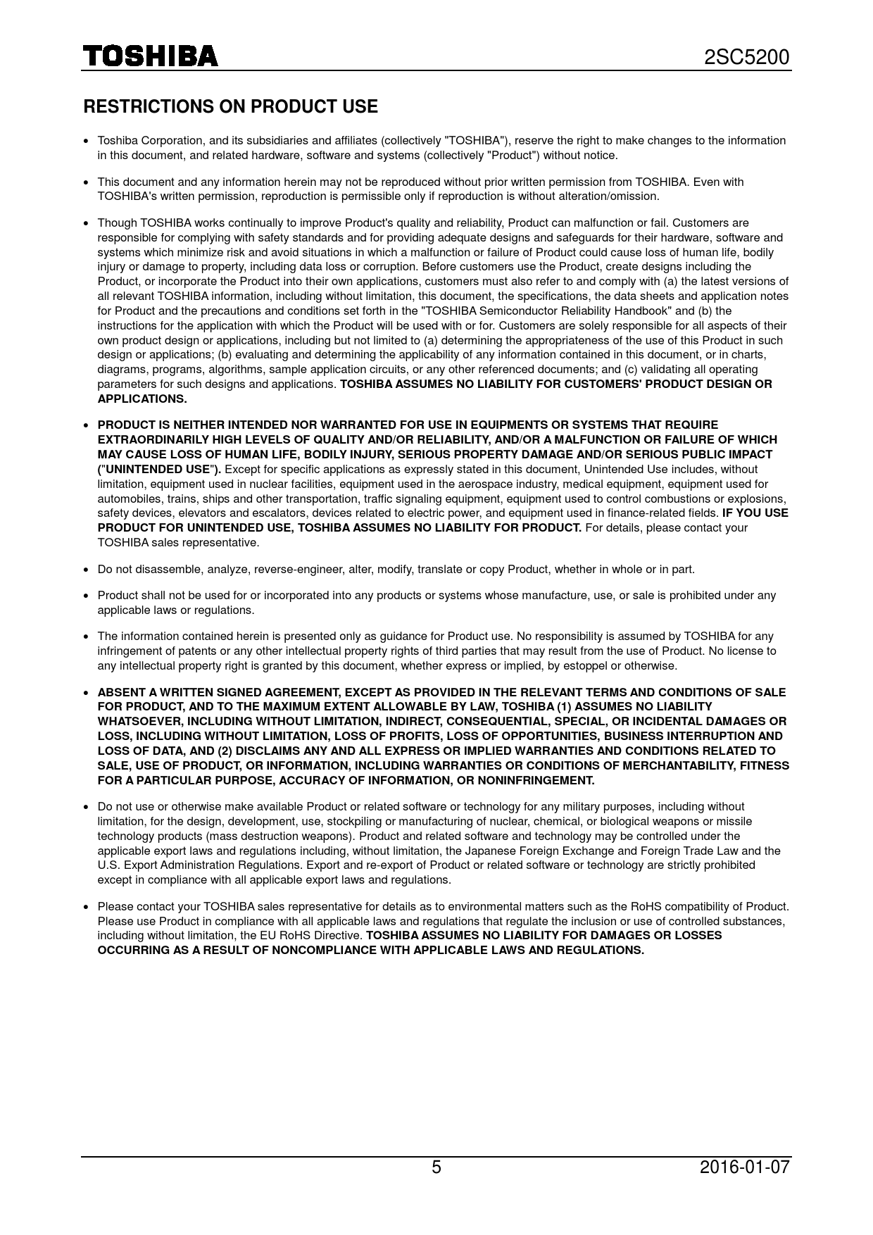 2SC5200 RESTRICTIONS ON PRODUCT USE • Toshiba Corporation, and its subsidiaries and affiliates (collectively "TOSHIBA"), reserve the right to make changes to the information in this document, and related hardware, software and systems (collectively "Product") without notice. • This document and any information herein may not be reproduced without prior written permission from TOSHIBA. Even with TOSHIBA's written permission, reproduction is permissible only if reproduction is without alteration/omission. • Though TOSHIBA works continually to improve Product's quality and reliability, Product can malfunction or fail. Customers are responsible for complying with safety standards and for providing adequate designs and safeguards for their hardware, software and systems which minimize risk and avoid situations in which a malfunction or failure of Product could cause loss of human life, bodily injury or damage to property, including data loss or corruption. Before customers use the Product, create designs including the Product, or incorporate the Product into their own applications, customers must also refer to and comply with (a) the latest versions of all relevant TOSHIBA information, including without limitation, this document, the specifications, the data sheets and application notes for Product and the precautions and conditions set forth in the "TOSHIBA Semiconductor Reliability Handbook" and (b) the instructions for the application with which the Product will be used with or for. Customers are solely responsible for all aspects of their own product design or applications, including but not limited to (a) determining the appropriateness of the use of this Product in such design or applications; (b) evaluating and determining the applicability of any information contained in this document, or in charts, diagrams, programs, algorithms, sample application circuits, or any other referenced documents; and (c) validating all operating parameters for such designs and applications. TOSHIBA ASSUMES NO LIABILITY FOR CUSTOMERS' PRODUCT DESIGN OR APPLICATIONS. • PRODUCT IS NEITHER INTENDED NOR WARRANTED FOR USE IN EQUIPMENTS OR SYSTEMS THAT REQUIREEXTRAORDINARILY HIGH LEVELS OF QUALITY AND/OR RELIABILITY, AND/OR A MALFUNCTION OR FAILURE OF WHICH MAY CAUSE LOSS OF HUMAN LIFE, BODILY INJURY, SERIOUS PROPERTY DAMAGE AND/OR SERIOUS PUBLIC IMPACT ( " UNINTENDED USE " ). Except for specific applications as expressly stated in this document, Unintended Use includes, without limitation, equipment used in nuclear facilities, equipment used in the aerospace industry, medical equipment, equipment used for automobiles, trains, ships and other transportation, traffic signaling equipment, equipment used to control combustions or explosions, safety devices, elevators and escalators, devices related to electric power, and equipment used in finance-related fields. IF YOU USE PRODUCT FOR UNINTENDED USE, TOSHIBA ASSUMES NO LIABILITY FOR PRODUCT. For details, please contact your TOSHIBA sales representative. • Do not disassemble, analyze, reverse-engineer, alter, modify, translate or copy Product, whether in whole or in part. • Product shall not be used for or incorporated into any products or systems whose manufacture, use, or sale is prohibited under any applicable laws or regulations. • The information contained herein is presented only as guidance for Product use. No responsibility is assumed by TOSHIBA for any infringement of patents or any other intellectual property rights of third parties that may result from the use of Product. No license to any intellectual property right is granted by this document, whether express or implied, by estoppel or otherwise. • ABSENT A WRITTEN SIGNED AGREEMENT, EXCEPT AS PROVIDED IN THE RELEVANT TERMS AND CONDITIONS OF SALEFOR PRODUCT, AND TO THE MAXIMUM EXTENT ALLOWABLE BY LAW, TOSHIBA (1) ASSUMES NO LIABILITY WHATSOEVER, INCLUDING WITHOUT LIMITATION, INDIRECT, CONSEQUENTIAL, SPECIAL, OR INCIDENTAL DAMAGES OR LOSS, INCLUDING WITHOUT LIMITATION, LOSS OF PROFITS, LOSS OF OPPORTUNITIES, BUSINESS INTERRUPTION AND LOSS OF DATA, AND (2) DISCLAIMS ANY AND ALL EXPRESS OR IMPLIED WARRANTIES AND CONDITIONS RELATED TO SALE, USE OF PRODUCT, OR INFORMATION, INCLUDING WARRANTIES OR CONDITIONS OF MERCHANTABILITY, FITNESS FOR A PARTICULAR PURPOSE, ACCURACY OF INFORMATION, OR NONINFRINGEMENT. • Do not use or otherwise make available Product or related software or technology for any military purposes, including without limitation, for the design, development, use, stockpiling or manufacturing of nuclear, chemical, or biological weapons or missile technology products (mass destruction weapons). Product and related software and technology may be controlled under the applicable export laws and regulations including, without limitation, the Japanese Foreign Exchange and Foreign Trade Law and the U.S. Export Administration Regulations. Export and re-export of Product or related software or technology are strictly prohibited except in compliance with all applicable export laws and regulations. • Please contact your TOSHIBA sales representative for details as to environmental matters such as the RoHS compatibility of Product. Please use Product in compliance with all applicable laws and regulations that regulate the inclusion or use of controlled substances, including without limitation, the EU RoHS Directive. TOSHIBA ASSUMES NO LIABILITY FOR DAMAGES OR LOSSES OCCURRING AS A RESULT OF NONCOMPLIANCE WITH APPLICABLE LAWS AND REGULATIONS. 5 2016-01-07