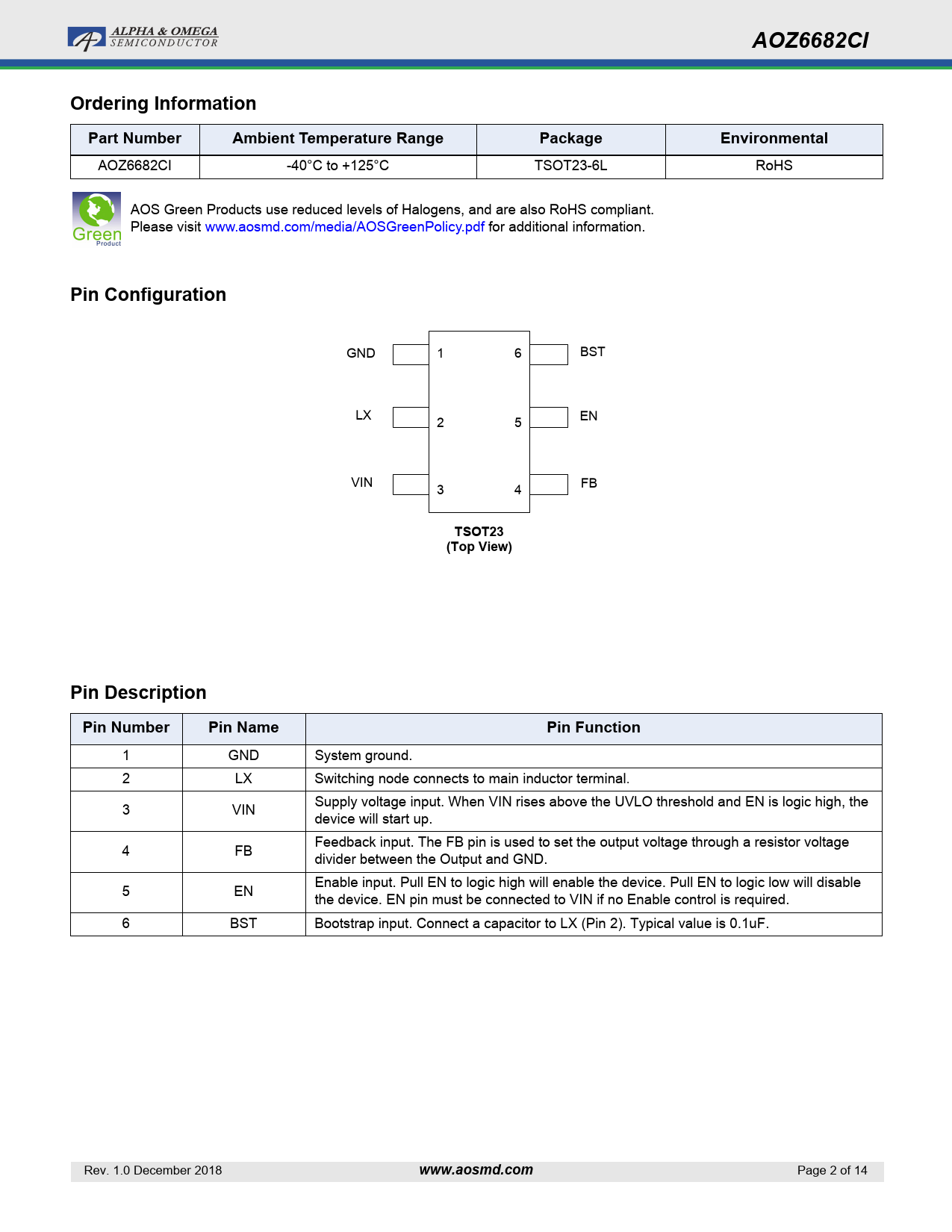 AOZ6682CI. Ordering Information. Part Number. Ambient Temperature Range. Package. Environmental. Pin Configuration. TSOT23. (Top View)