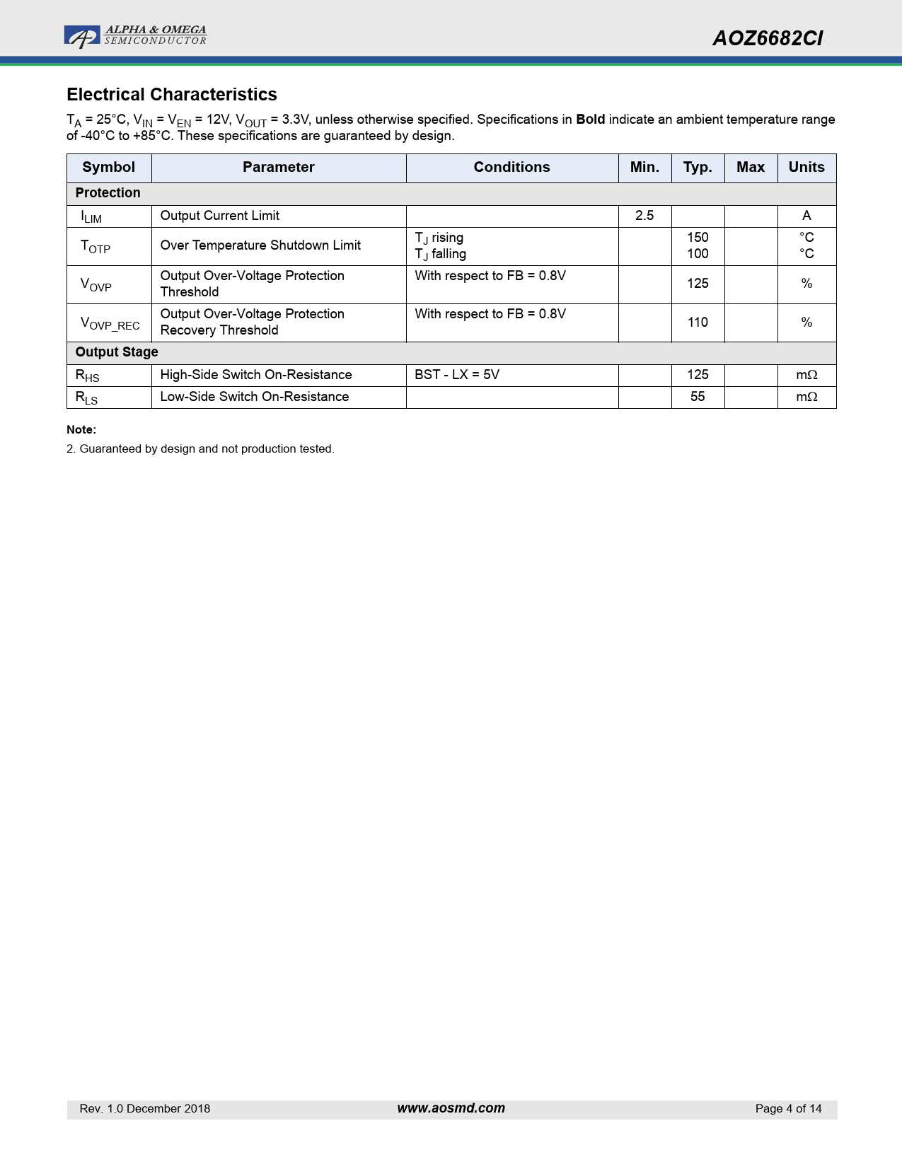 AOZ6682CI. Electrical Characteristics. Bold. Symbol. Parameter. Conditions. Min. Typ. Max. Units. Protection. Output Stage. Note:. www.aosmd.com