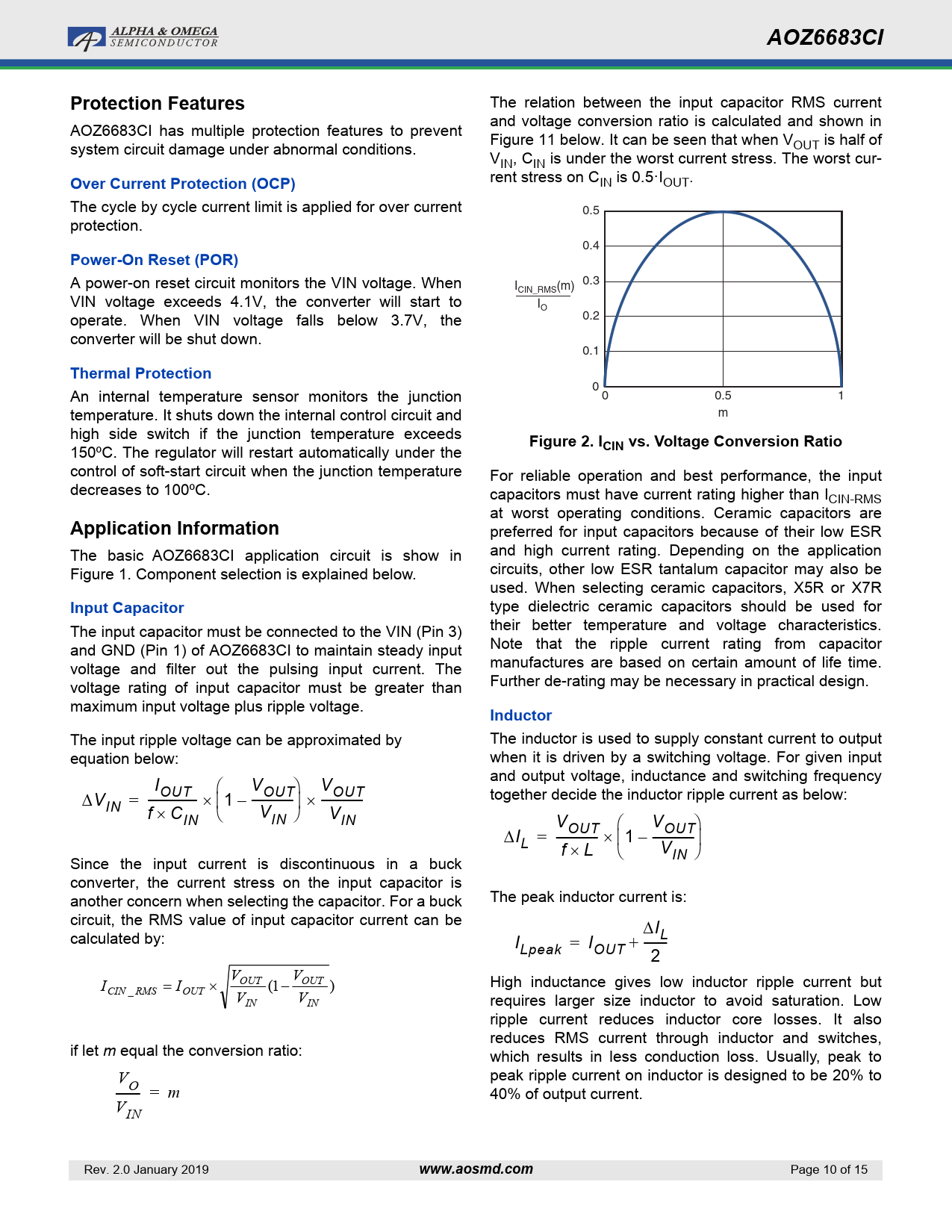 The relation between the input capacitor RMS current and voltage conversion ratio is calculated and shown in AOZ6683CI has multiple protection features to prevent Figure 11 below. It can be seen that when V system circuit damage under abnormal conditions. OUT is half of VIN, CIN is under the worst current stress. The worst cur-