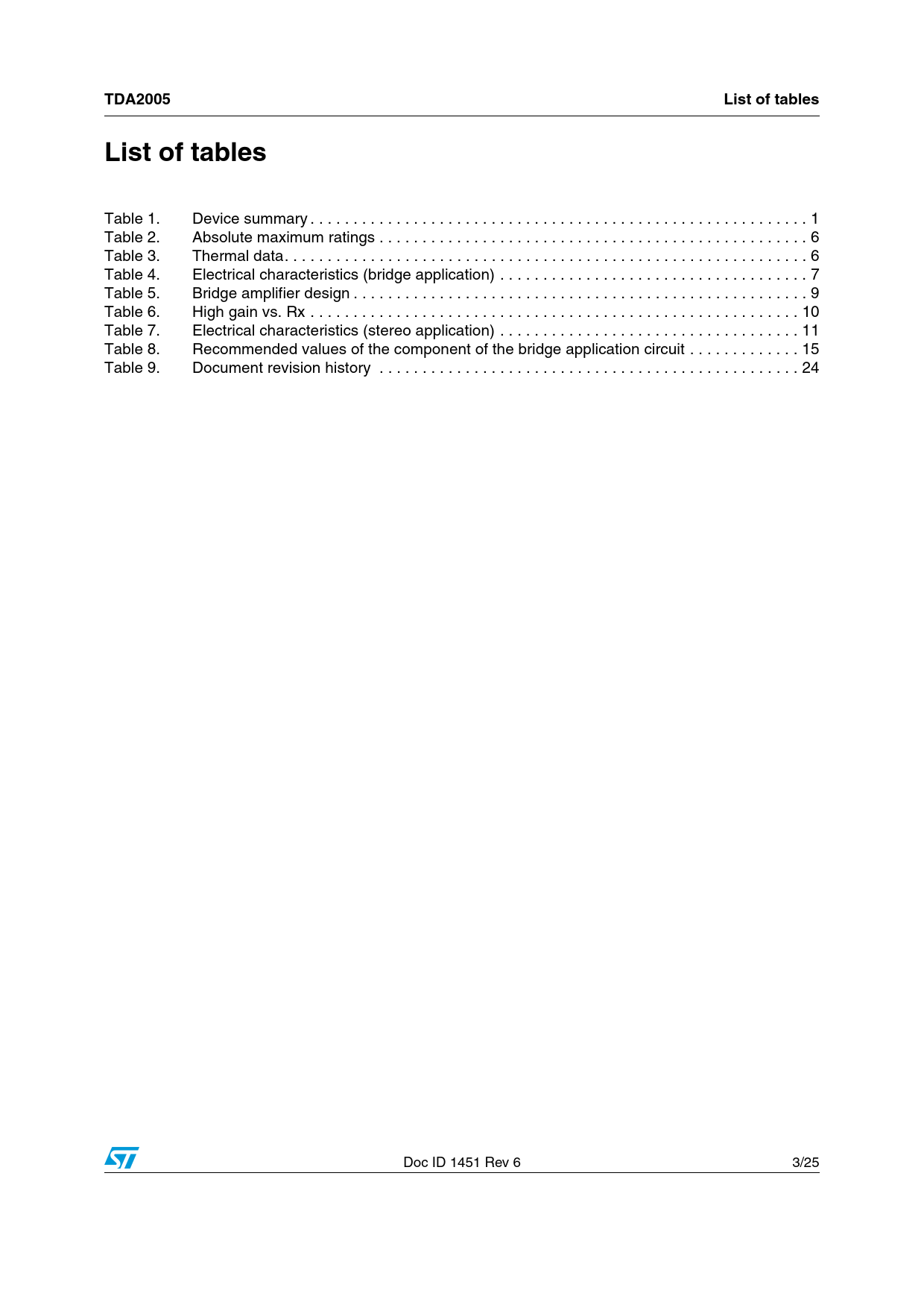 link to page 1 link to page 6 link to page 6 link to page 7 link to page 9 link to page 10 link to page 11 link to page 15 link to page 24 TDA2005List of tablesList of tables Table 1. Device summary . 1 Table 2. Absolute maximum ratings . 6 Table 3. Thermal data. 6 Table 4. Electrical characteristics (bridge application) . 7 Table 5. Bridge amplifier design . 9 Table 6. High gain vs. Rx . 10 Table 7. Electrical characteristics (stereo application) . 11 Table 8. Recommended values of the component of the bridge application circuit . 15 Table 9. Document revision history . 24 Doc ID 1451 Rev 6 3/25 Document Outline Table 1. Device summary 1 Schematic and pins connection diagrams Figure 1. Schematic diagram Figure 2. Pins connection diagram (top view) 2 Electrical specifications 2.1 Absolute maximum ratings Table 2. Absolute maximum ratings 2.2 Thermal data Table 3. Thermal data 2.3 Bridge amplifier section Figure 3. Test and application circuit (bridge amplifier) Figure 4. PC board and components layout of Figure 3 2.3.1 Electrical characteristics (bridge application) Table 4. Electrical characteristics (bridge application) Figure 5. Output offset voltage vs. supply voltage Figure 6. Distortion vs. output power (RL = 4 W) Figure 7. Distortion vs. output power (RL = 3.2 W) 2.3.2 Bridge amplifier design Table 5. Bridge amplifier design Table 6. High gain vs. Rx Figure 8. Bridge configuration 2.4 Stereo amplifier application Figure 9. Typical stereo application circuit 2.4.1 Electrical characteristics (stereo application) Table 7. Electrical characteristics (stereo application) Figure 10. Quiescent output voltage vs. supply voltage (stereo amplifier) Figure 11. Quiescent drain current vs. supply voltage (stereo amplifier) Figure 12. Distortion vs. output power (stereo amplifier) Figure 13. Output power vs. supply voltage, RL = 2 and 4 W (stereo amplifier) Figure 14. Output power vs. supply voltage, RL = 1.6 and 3.2 W (stereo amplifier) Figure 15. Distortion vs. frequency, RL = 2 and 4 W (stereo amplifier) Figure 16. Distortion vs. frequency, RL = 1.6 and 3.2 W (stereo amplifier) Figure 17. Supply voltage rejection vs. C3 (stereo amplifier) Figure 18. Supply voltage rejection vs. frequency (stereo amplifier) Figure 19. Supply voltage rejection vs. C2 and C3, GV = 390/1 W (stereo amplifier) Figure 20. Supply voltage rejection vs. C2 and C3, GV = 1000/10 W (stereo amplifier) Figure 21. Gain vs. input sensitivity RL = 4 W (stereo amplifier) Figure 22. Gain vs. input sensitivity RL = 2 W (stereo amplifier) Figure 23. Total power dissipation and efficiency vs. output power (bridge) Figure 24. Total power dissipation and efficiency vs. output power (stereo) 3 Application suggestion Table 8. Recommended values of the component of the bridge application circuit 4 Application information Figure 25. Bridge amplifier without boostrap Figure 26. PC board and components layout of Figure 25 Figure 27. Low cost bridge amplifier (GV = 42 dB) Figure 28. PC board and components layout of Figure 27 Figure 29. 10 + 10 W stereo amplifier with tone balance and loudness control Figure 30. Tone control response (circuit of Figure 29) Figure 31. 20 W bus amplifier Figure 32. Simple 20 W two way amplifier (FC = 2 kHz) Figure 33. Bridge amplifier circuit suited for low-gain applications (GV = 34 dB) Figure 34. Example of muting circuit 4.1 Built-in protection systems 4.1.1 Load dump voltage surge Figure 35. Suggested LC network circuit Figure 36. Voltage gain bridge configuration 4.1.2 Short circuit (AC and DC conditions) 4.1.3 Polarity inversion 4.1.4 Open ground 4.1.5 Inductive load 4.1.6 DC voltage 4.1.7 Thermal shut-down 4.1.8 Loudspeaker protection Figure 37. Maximum allowable power dissipation vs. ambient temperature Figure 38. Output power and drain current vs. case temperature (RL = 4 W) Figure 39. Output power and drain current vs. case temperature (RL = 3.2 W) 5 Package information Figure 40. Multiwatt11 mechanical data and package dimensions 6 Revision history Table 9. Document revision history