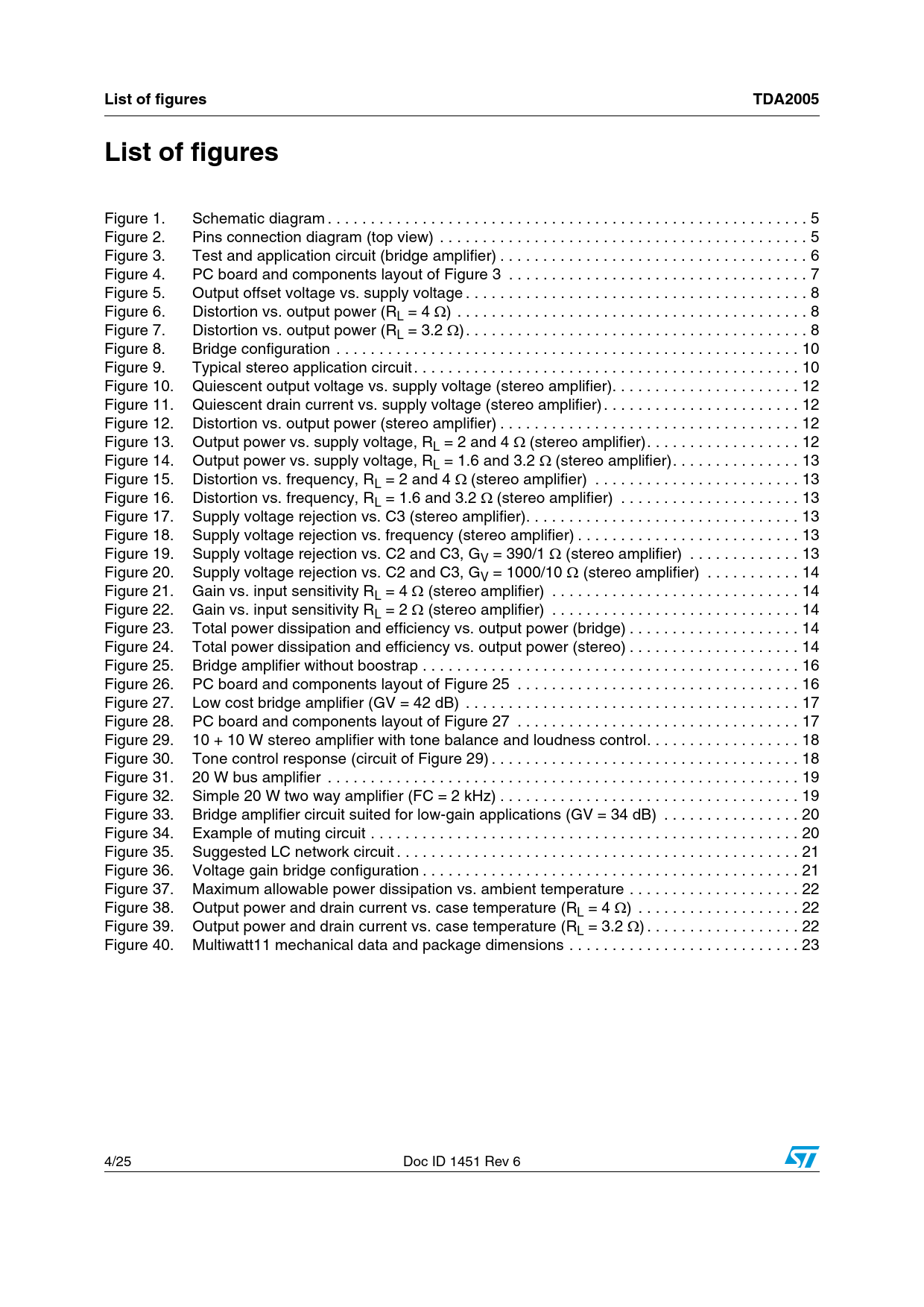 link to page 5 link to page 5 link to page 6 link to page 7 link to page 8 link to page 8 link to page 8 link to page 10 link to page 10 link to page 12 link to page 12 link to page 12 link to page 12 link to page 13 link to page 13 link to page 13 link to page 13 link to page 13 link to page 13 link to page 14 link to page 14 link to page 14 link to page 14 link to page 14 link to page 16 link to page 16 link to page 17 link to page 17 link to page 18 link to page 18 link to page 19 link to page 19 link to page 20 link to page 20 link to page 21 link to page 21 link to page 22 link to page 22 link to page 22 link to page 23 List of figuresTDA2005List of figures Figure 1. Schematic diagram . 5 Figure 2. Pins connection diagram (top view) . 5 Figure 3. Test and application circuit (bridge amplifier) . 6 Figure 4. PC board and components layout of Figure 3 . 7 Figure 5. Output offset voltage vs. supply voltage . 8 Figure 6. Distortion vs. output power (RL = 4 ) . 8 Figure 7. Distortion vs. output power (RL = 3.2 ). 8 Figure 8. Bridge configuration . 10 Figure 9. Typical stereo application circuit . 10 Figure 10. Quiescent output voltage vs. supply voltage (stereo amplifier). 12 Figure 11. Quiescent drain current vs. supply voltage (stereo amplifier) . 12 Figure 12. Distortion vs. output power (stereo amplifier) . 12 Figure 13. Output power vs. supply voltage, RL = 2 and 4 (stereo amplifier). 12 Figure 14. Output power vs. supply voltage, RL = 1.6 and 3.2 (stereo amplifier). 13 Figure 15. Distortion vs. frequency, RL = 2 and 4 (stereo amplifier) . 13 Figure 16. Distortion vs. frequency, RL = 1.6 and 3.2 (stereo amplifier) . 13 Figure 17. Supply voltage rejection vs. C3 (stereo amplifier). 13 Figure 18. Supply voltage rejection vs. frequency (stereo amplifier) . 13 Figure 19. Supply voltage rejection vs. C2 and C3, GV = 390/1 (stereo amplifier) . 13 Figure 20. Supply voltage rejection vs. C2 and C3, GV = 1000/10 (stereo amplifier) . 14 Figure 21. Gain vs. input sensitivity RL = 4 (stereo amplifier) . 14 Figure 22. Gain vs. input sensitivity RL = 2 (stereo amplifier) . 14 Figure 23. Total power dissipation and efficiency vs. output power (bridge) . 14 Figure 24. Total power dissipation and efficiency vs. output power (stereo) . 14 Figure 25. Bridge amplifier without boostrap . 16 Figure 26. PC board and components layout of Figure 25 . 16 Figure 27. Low cost bridge amplifier (GV = 42 dB) . 17 Figure 28. PC board and components layout of Figure 27 . 17 Figure 29. 10 + 10 W stereo amplifier with tone balance and loudness control. 18 Figure 30. Tone control response (circuit of Figure 29) . 18 Figure 31. 20 W bus amplifier . 19 Figure 32. Simple 20 W two way amplifier (FC = 2 kHz) . 19 Figure 33. Bridge amplifier circuit suited for low-gain applications (GV = 34 dB) . 20 Figure 34. Example of muting circuit . 20 Figure 35. Suggested LC network circuit . 21 Figure 36. Voltage gain bridge configuration . 21 Figure 37. Maximum allowable power dissipation vs. ambient temperature . 22 Figure 38. Output power and drain current vs. case temperature (RL = 4 ) . 22 Figure 39. Output power and drain current vs. case temperature (RL = 3.2 ) . 22 Figure 40. Multiwatt11 mechanical data and package dimensions . 23 4/25 Doc ID 1451 Rev 6 Document Outline Table 1. Device summary 1 Schematic and pins connection diagrams Figure 1. Schematic diagram Figure 2. Pins connection diagram (top view) 2 Electrical specifications 2.1 Absolute maximum ratings Table 2. Absolute maximum ratings 2.2 Thermal data Table 3. Thermal data 2.3 Bridge amplifier section Figure 3. Test and application circuit (bridge amplifier) Figure 4. PC board and components layout of Figure 3 2.3.1 Electrical characteristics (bridge application) Table 4. Electrical characteristics (bridge application) Figure 5. Output offset voltage vs. supply voltage Figure 6. Distortion vs. output power (RL = 4 W) Figure 7. Distortion vs. output power (RL = 3.2 W) 2.3.2 Bridge amplifier design Table 5. Bridge amplifier design Table 6. High gain vs. Rx Figure 8. Bridge configuration 2.4 Stereo amplifier application Figure 9. Typical stereo application circuit 2.4.1 Electrical characteristics (stereo application) Table 7. Electrical characteristics (stereo application) Figure 10. Quiescent output voltage vs. supply voltage (stereo amplifier) Figure 11. Quiescent drain current vs. supply voltage (stereo amplifier) Figure 12. Distortion vs. output power (stereo amplifier) Figure 13. Output power vs. supply voltage, RL = 2 and 4 W (stereo amplifier) Figure 14. Output power vs. supply voltage, RL = 1.6 and 3.2 W (stereo amplifier) Figure 15. Distortion vs. frequency, RL = 2 and 4 W (stereo amplifier) Figure 16. Distortion vs. frequency, RL = 1.6 and 3.2 W (stereo amplifier) Figure 17. Supply voltage rejection vs. C3 (stereo amplifier) Figure 18. Supply voltage rejection vs. frequency (stereo amplifier) Figure 19. Supply voltage rejection vs. C2 and C3, GV = 390/1 W (stereo amplifier) Figure 20. Supply voltage rejection vs. C2 and C3, GV = 1000/10 W (stereo amplifier) Figure 21. Gain vs. input sensitivity RL = 4 W (stereo amplifier) Figure 22. Gain vs. input sensitivity RL = 2 W (stereo amplifier) Figure 23. Total power dissipation and efficiency vs. output power (bridge) Figure 24. Total power dissipation and efficiency vs. output power (stereo) 3 Application suggestion Table 8. Recommended values of the component of the bridge application circuit 4 Application information Figure 25. Bridge amplifier without boostrap Figure 26. PC board and components layout of Figure 25 Figure 27. Low cost bridge amplifier (GV = 42 dB) Figure 28. PC board and components layout of Figure 27 Figure 29. 10 + 10 W stereo amplifier with tone balance and loudness control Figure 30. Tone control response (circuit of Figure 29) Figure 31. 20 W bus amplifier Figure 32. Simple 20 W two way amplifier (FC = 2 kHz) Figure 33. Bridge amplifier circuit suited for low-gain applications (GV = 34 dB) F