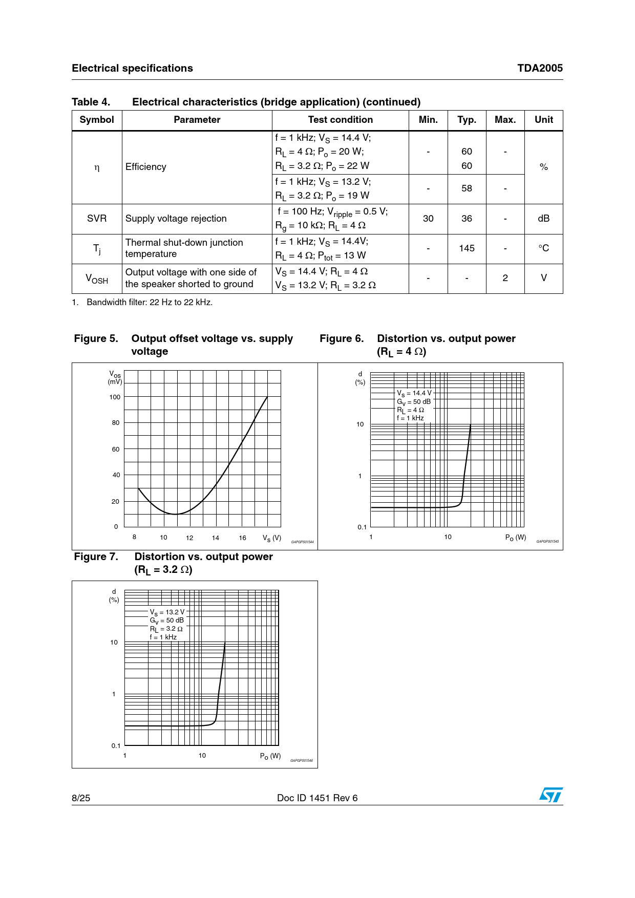 Electrical specificationsTDA2005Table 4.Electrical characteristics (bridge application) (continued)SymbolParameterTest conditionMin.Typ.Max.Unit f = 1 kHz; VS = 14.4 V; RL = 4 ;Po = 20 W; - 60 - Efficiency RL = 3.2 ;Po = 22 W 60 % f = 1 kHz; VS = 13.2 V; - 58 - RL = 3.2 ;Po = 19 W f = 100 Hz; V SVR Supply voltage rejection ripple = 0.5 V; Rg = 10 k; RL = 4 30 36 - dB Thermal shut-down junction f = 1 kHz; V T S = 14.4V; j - 145 - °C temperature RL = 4 ;Ptot = 13 W Output voltage with one side of V V S = 14.4 V; RL = 4 OSH the speaker shorted to ground VS = 13.2 V; RL = 3.2 - - 2 V 1. Bandwidth filter: 22 Hz to 22 kHz. Figure 5.Output offset voltage vs. supplyFigure 6.Distortion vs. output powervoltage(RL = 4) 6OS D M6 6 S 'V 2, F 6S 0O '!0'03 '!0'03 Figure 7.Distortion vs. output power(RL = 3.2) D 6S 'V 2, F 0O '!0'03 8/25 Doc ID 1451 Rev 6 Document Outline Table 1. Device summary 1 Schematic and pins connection diagrams Figure 1. Schematic diagram Figure 2. Pins connection diagram (top view) 2 Electrical specifications 2.1 Absolute maximum ratings Table 2. Absolute maximum ratings 2.2 Thermal data Table 3. Thermal data 2.3 Bridge amplifier section Figure 3. Test and application circuit (bridge amplifier) Figure 4. PC board and components layout of Figure 3 2.3.1 Electrical characteristics (bridge application) Table 4. Electrical characteristics (bridge application) Figure 5. Output offset voltage vs. supply voltage Figure 6. Distortion vs. output power (RL = 4 W) Figure 7. Distortion vs. output power (RL = 3.2 W) 2.3.2 Bridge amplifier design Table 5. Bridge amplifier design Table 6. High gain vs. Rx Figure 8. Bridge configuration 2.4 Stereo amplifier application Figure 9. Typical stereo application circuit 2.4.1 Electrical characteristics (stereo application) Table 7. Electrical characteristics (stereo application) Figure 10. Quiescent output voltage vs. supply voltage (stereo amplifier) Figure 11. Quiescent drain current vs. supply voltage (stereo amplifier) Figure 12. Distortion vs. output power (stereo amplifier) Figure 13. Output power vs. supply voltage, RL = 2 and 4 W (stereo amplifier) Figure 14. Output power vs. supply voltage, RL = 1.6 and 3.2 W (stereo amplifier) Figure 15. Distortion vs. frequency, RL = 2 and 4 W (stereo amplifier) Figure 16. Distortion vs. frequency, RL = 1.6 and 3.2 W (stereo amplifier) Figure 17. Supply voltage rejection vs. C3 (stereo amplifier) Figure 18. Supply voltage rejection vs. frequency (stereo amplifier) Figure 19. Supply voltage rejection vs. C2 and C3, GV = 390/1 W (stereo amplifier) Figure 20. Supply voltage rejection vs. C2 and C3, GV = 1000/10 W (stereo amplifier) Figure 21. Gain vs. input sensitivity RL = 4 W (stereo amplifier) Figure 22. Gain vs. input sensitivity RL = 2 W (stereo amplifier) Figure 23. Total power dissipation and efficiency vs. output power (bridge) Figure 24. Total power dissipation and efficiency vs. output power (stereo) 3 Application suggestion Table 8. Recommended values of the component of the bridge application circuit 4 Application information Figure 25. Bridge amplifier without boostrap Figure 26. PC board and components layout of Figure 25 Figure 27. Low cost bridge amplifier (GV = 42 dB) Figure 28. PC board and components layout of Figure 27 Figure 29. 10 + 10 W stereo amplifier with tone balance and loudness control Figure 30. Tone control response (circuit of Figure 29) Figure 31. 20 W bus amplifier Figure 32. Simple 20 W two way amplifier (FC = 2 kHz) Figure 33. Bridge amplifier circuit suited for low-gain applications (GV = 34 dB) Figure 34. Example of muting circuit 4.1 Built-in protection systems 4.1.1 Load dump voltage surge Figure 35. Suggested LC network circuit Figure 36. Voltage gain bridge configuration 4.1.2 Short circuit (AC and DC conditions) 4.1.3 Polarity inversion 4.1.4 Open ground 4.1.5 Inductive load 4.1.6 DC voltage 4.1.7 Thermal shut-down 4.1.8 Loudspeaker protection Figure 37. Maximum allowable power dissipation vs. ambient temperature Figure 38. Output power and drain current vs. case temperature (RL = 4 W) Figure 39. Output power and drain current vs. case temperature (RL = 3.2 W) 5 Package information Figure 40. Multiwatt11 mechanical data and package dimensions 6 Revision history Table 9. Document revision history